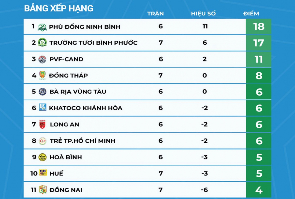 Bảng xếp hạng giải hạng Nhất Quốc gia được người hâm mộ chú ý khi Ninh Bình và Bình Phước đang tạo nên cuộc đua thú vị tới ngôi vô địch. Đang đứng đầu bảng xếp hạng, Ninh Bình hiện chỉ hơn Bình Phước 1 điểm nhưng thi đấu ít hơn một trận.