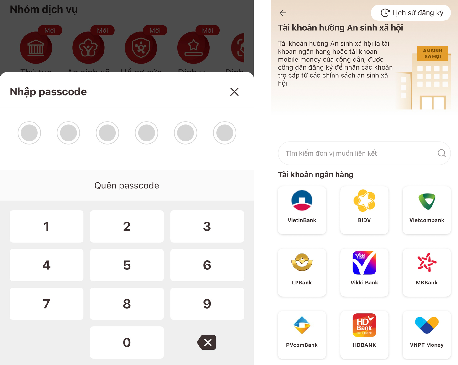 Người dân có tài khoản ngân hàng và tài khoản định danh điện tử VNeID mức độ 2 có thể thực hiện tích hợp ngay trên ứng dụng. Tài khoản nhận an sinh xã hội có thể là tài khoản ngân hàng hoặc tài khoản mobile money.