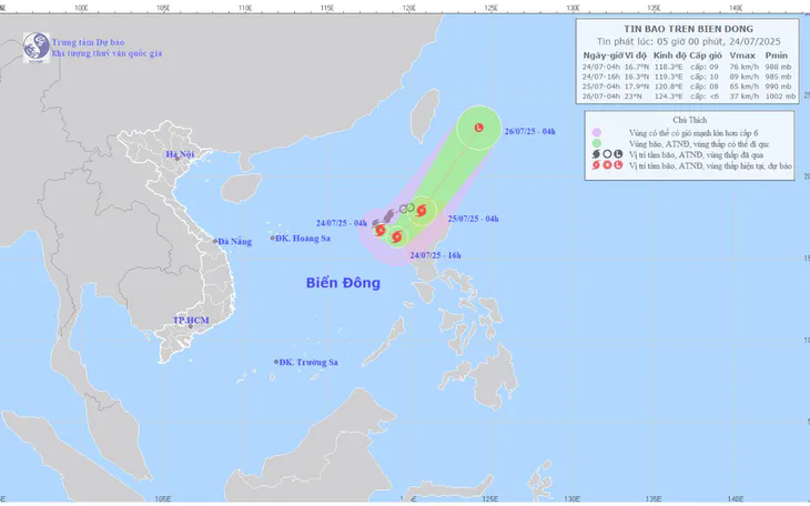 Dự báo trong chiều nay, bão có thể mạnh thêm, lên cấp 9-10, giật cấp 12. Bão ít có khả năng ảnh hưởng trực tiếp tới đất liền nước ta. Bão sẽ đổi hướng từ Đông Đông Nam chuyển sang Đông Bắc, sáng sớm mai (25/7) sẽ hướng vòng ngược ra khỏi Biển Đông.