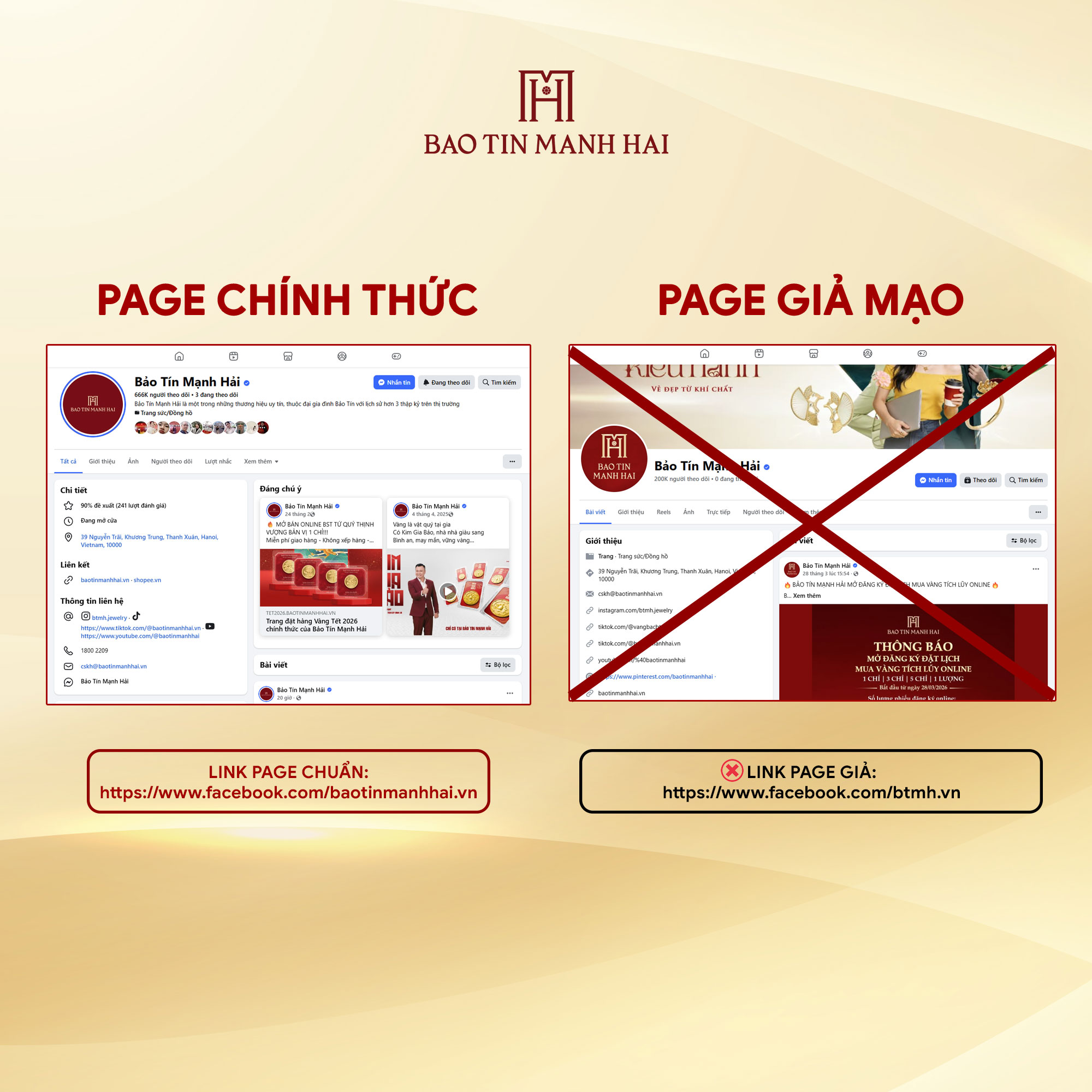 Mọi Fanpage có đường link không trùng khớp hoàn toàn với “baotinmanhhai.vn” (ví dụ: thêm ký tự, thay đổi đuôi, viết sai chính tả, viết tắt…) đều là giả mạo và không thuộc Bảo Tín Mạnh Hải.