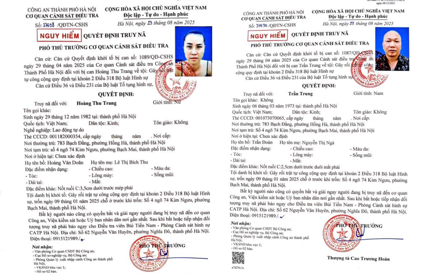 Ngày 29/4/2025, Cơ quan Cảnh sát điều tra Công an TP Hà Nội đã ra quyết định khởi tố bị can đối với Trần Trung và Hoàng Thu Trang về tội “Gây rối trật tự công cộng”. Tuy nhiên, cả hai đã bỏ trốn khỏi nơi cư trú. Đến ngày 29/8/2025, cơ quan điều tra phát lệnh truy nã toàn quốc đối với hai đối tượng này.