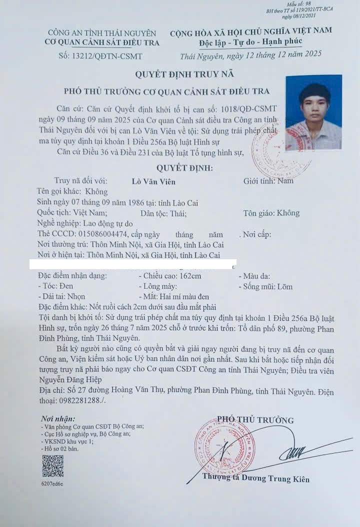 Qua xác minh, Viên là đối tượng bị Công an tỉnh Thái Nguyên truy nã về tội Sử dụng trái phép chất ma túy theo quyết định truy nã ngày 12/12/2025.