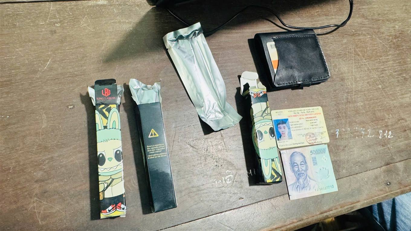Ngay lập tức, Tổ công tác đã yêu cầu kiểm tra đối với người nam giới trên, qua kiểm tra phát hiện đối tượng đang đeo túi xách trên người có 03 ống Pod Chill hình trụ tròn, bên trên có dãn nhãn hiệu “KING LABUBU”, bên trong các ống có chứa chất ma túy theo như đối tượng Tùng khai nhận.