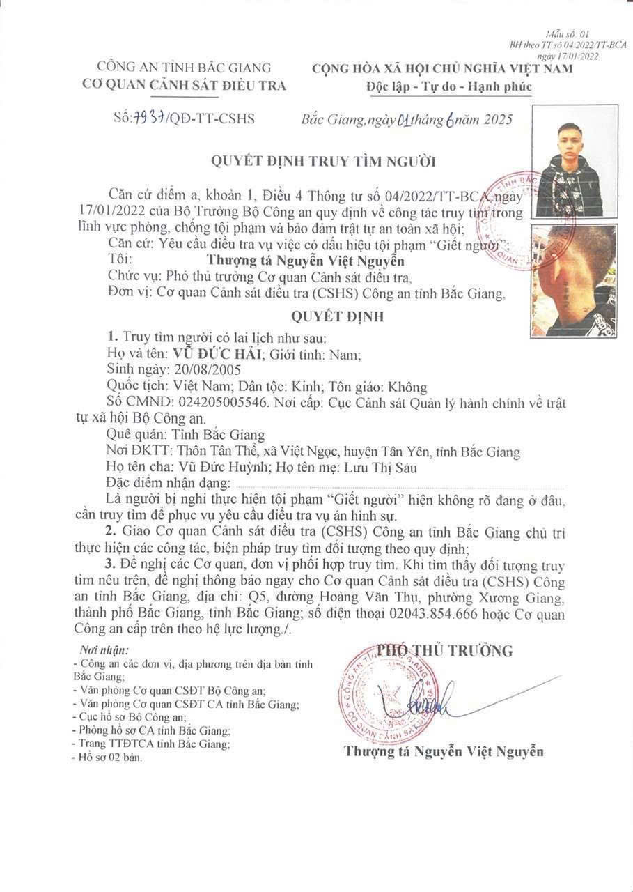 Quyết định truy tìm Vũ Đức Hải - Ảnh: Công an Bắc Giang