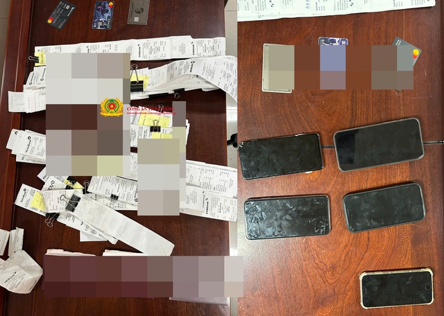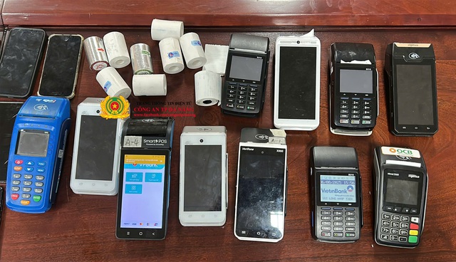 Tại thời điểm bắt giữ, công an thu giữ 11 máy POS, 196 biên lai, 3 thẻ card thanh toán quốc tế, 2 máy tính xách tay và 10 điện thoại di động...
