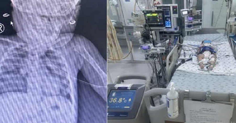 Tại thời điểm nhập viện, bé V. hôn mê sâu, co giật, co gồng, nồng độ oxy máu chỉ đạt 84% (bình thường trên 95%), nhịp tim nhanh, huyết áp tụt. Kết quả xét nghiệm cho thấy, trẻ bị toan chuyển hóa nặng (tình trạng máu bị nhiễm axit do thiếu oxy, có thể gây suy đa cơ quan do thiếu oxy máu). Hình ảnh X-quang phổi ghi nhận thâm nhiễm hai bên, hình ảnh CT-Scan não cho thấy trẻ bị phù não lan tỏa.