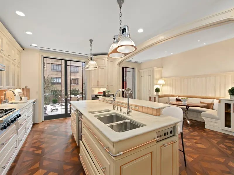 Tầng ba của căn biệt thự là nhà bếp với tầm nhìn hướng ra sân thượng rộng rãi, chỗ ngồi êm ái và đài phun nước tạo nên một không gian sân vườn hiếm thấy giữa nhịp sống hối hả của Manhattan.