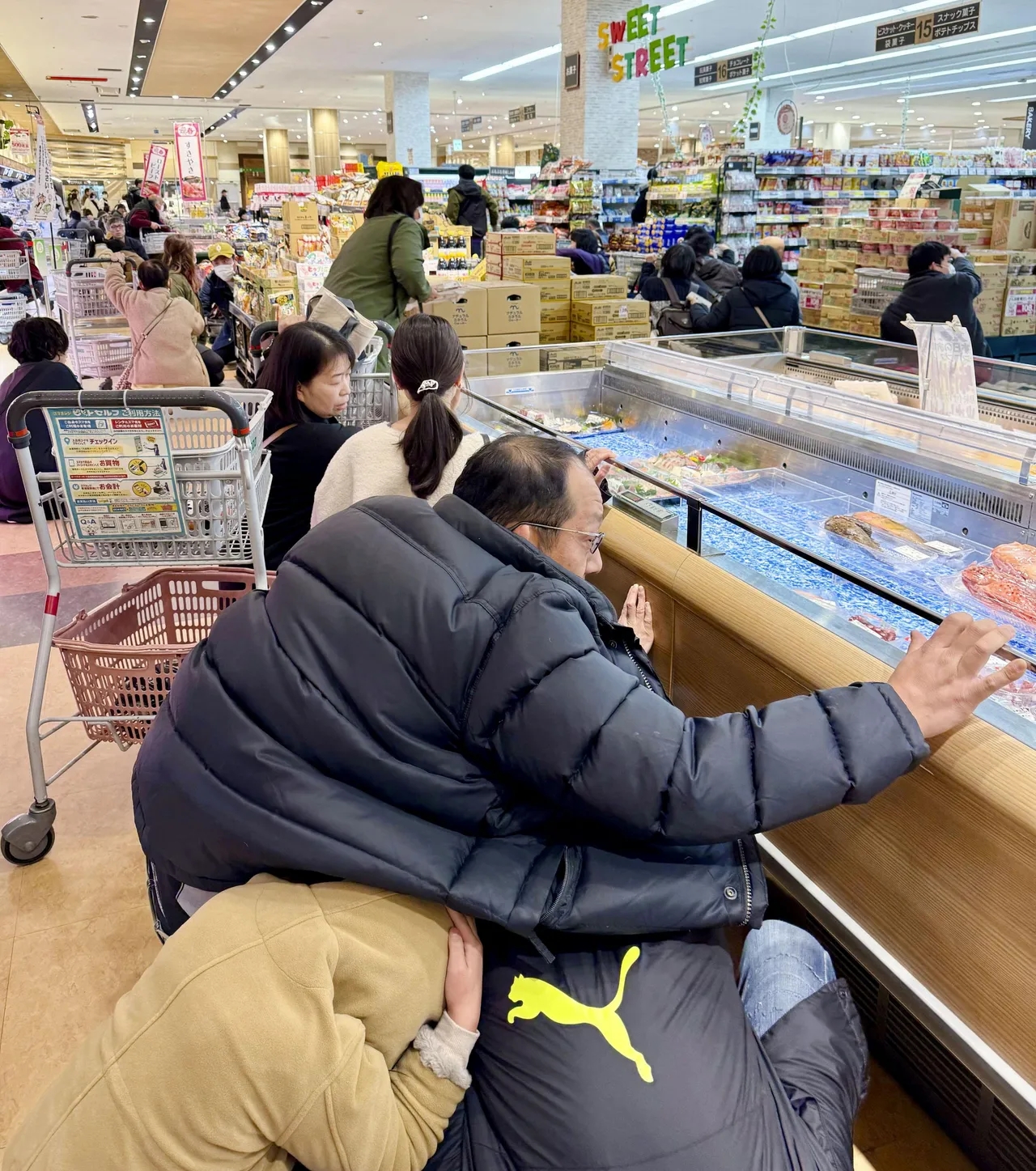 Người mua hàng cúi xuống khi trận động đất xảy ra tại một siêu thị ở Toyama, Nhật Bản. Ảnh: Kyodo News