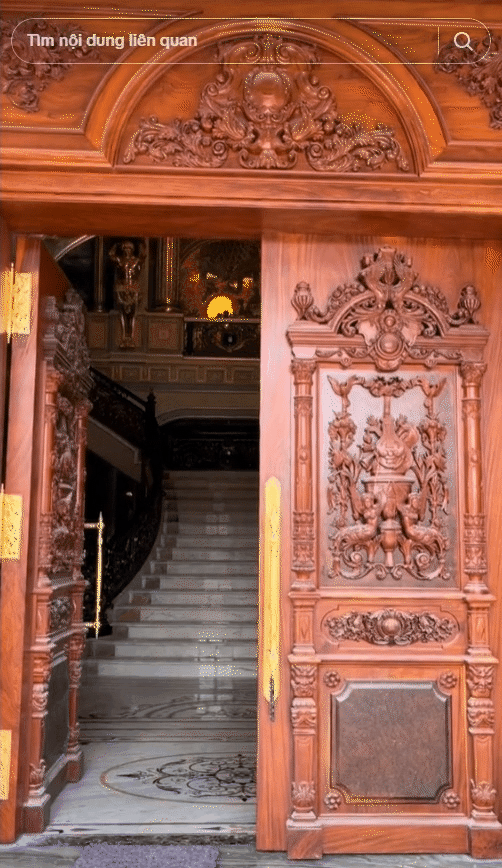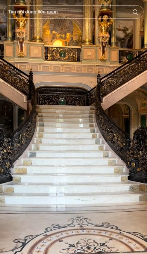 Đằng sau tấm cửa gỗ được chạm trổ tinh xảo đến từng cm ấy là một không gian vô cùng xa hoa, vương giả. Chính giữa căn phòng là chiếc cầu thang lớn - nơi kết nối giữa các không gian và các tầng trong tòa lâu đài.