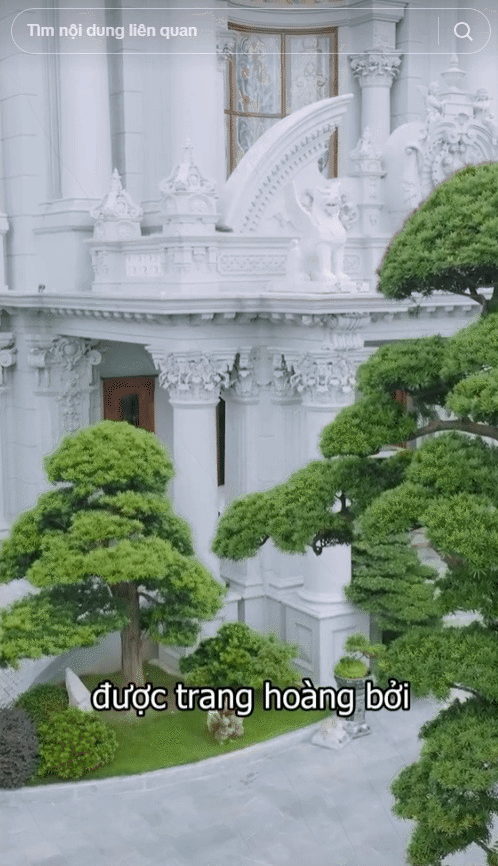 Bước vào sân nhà, một tòa lâu đài trắng nằm sừng sững giữa khuôn viện rộng đến cả nghìn m2. Xung quanh sân, gia chủ cho bài trí những chậu cây cảnh quý, có thể sân vườn còn có cả cây tùng Nhật - loại cây quý phải chuyển từ nước ngoài về, và chỉ có những gia đình thật sự vương giả mới có thú chơi xa xỉ này.