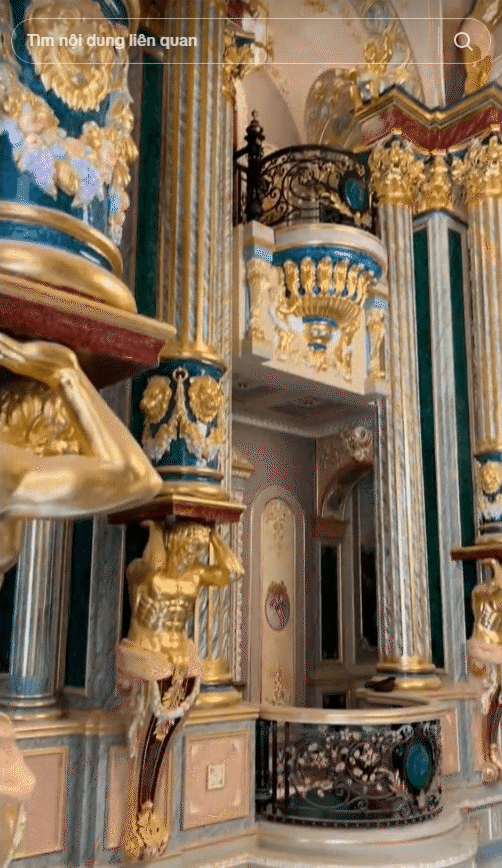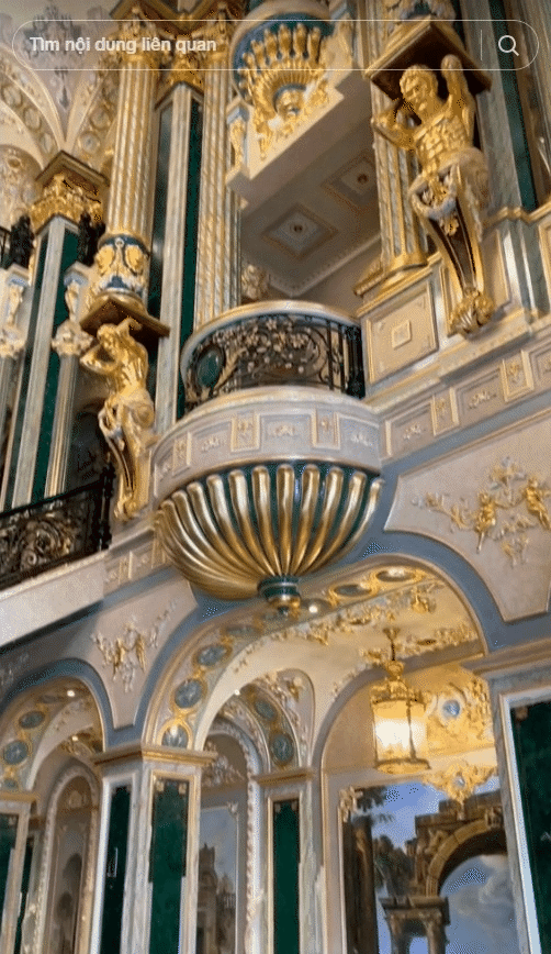 Một tòa lâu đài cổ tích được mở ra với thiết kế vô cùng nguy nga, tráng lệ. Từng chi tiết trong văn phòng đều được thiết kế tỉ mỉ, sắc sảo và mang âm hưởng của kiến trúc thần thoại Hy Lạp. Từng chiếc cột nhà, bức tượng đường bài trí đều được mạ vàng sáng bóng, bức trang trên trần nhà được vẽ trên nền dát vàng... thể hiện sự xa hoa và phong cách sống thượng lưu của gia chủ.