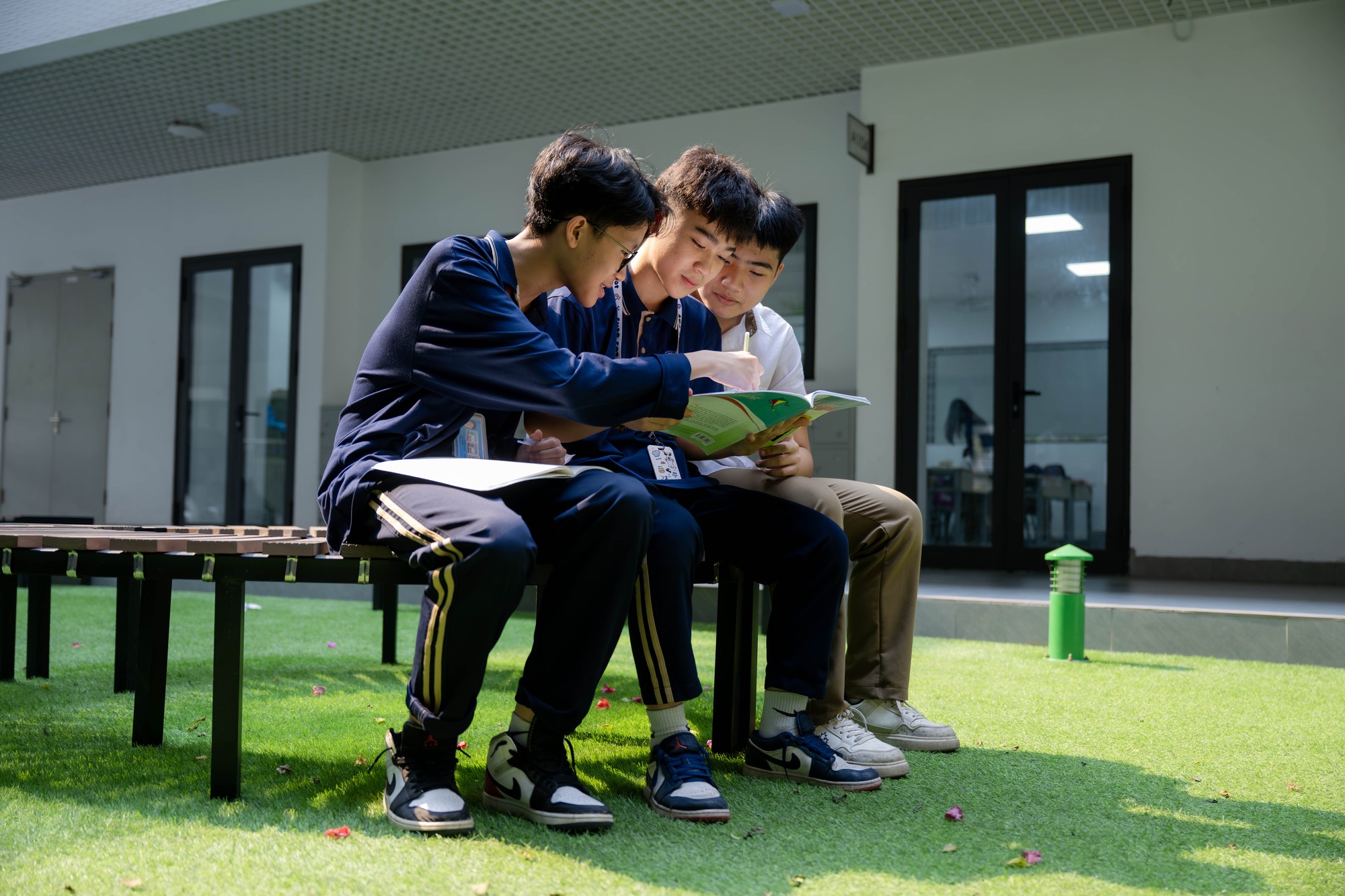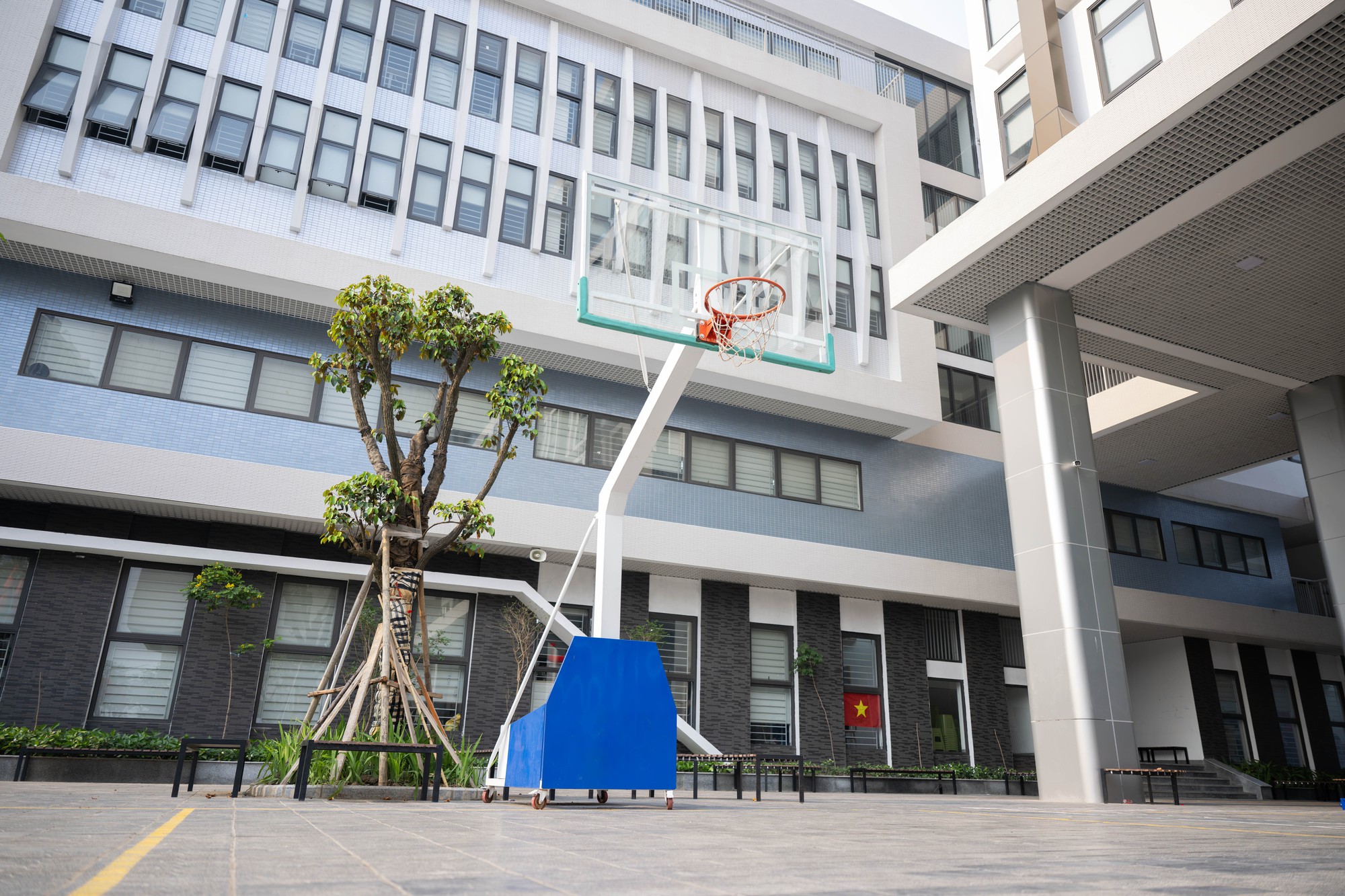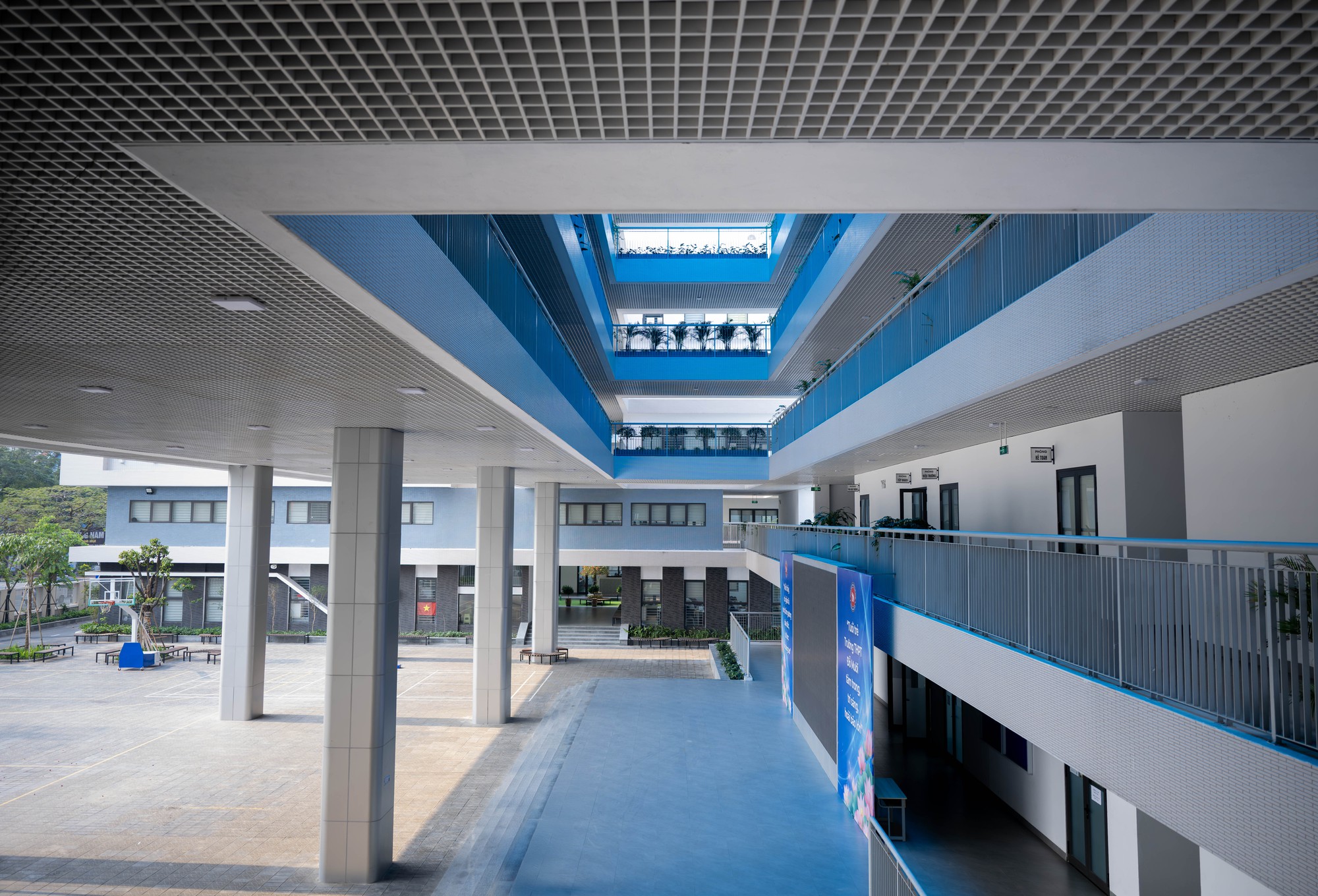 Không chỉ dừng lại ở quy mô, cách tổ chức không gian bên trong trường cũng là yếu tố khiến nhiều người ấn tượng. Có một khu vực được các bạn gọi vui là “công viên” thực chất là giếng trời nằm giữa hai khối phòng học, được thiết kế thành không gian mở để vui chơi, đọc sách và thư giãn trong giờ ra chơi.