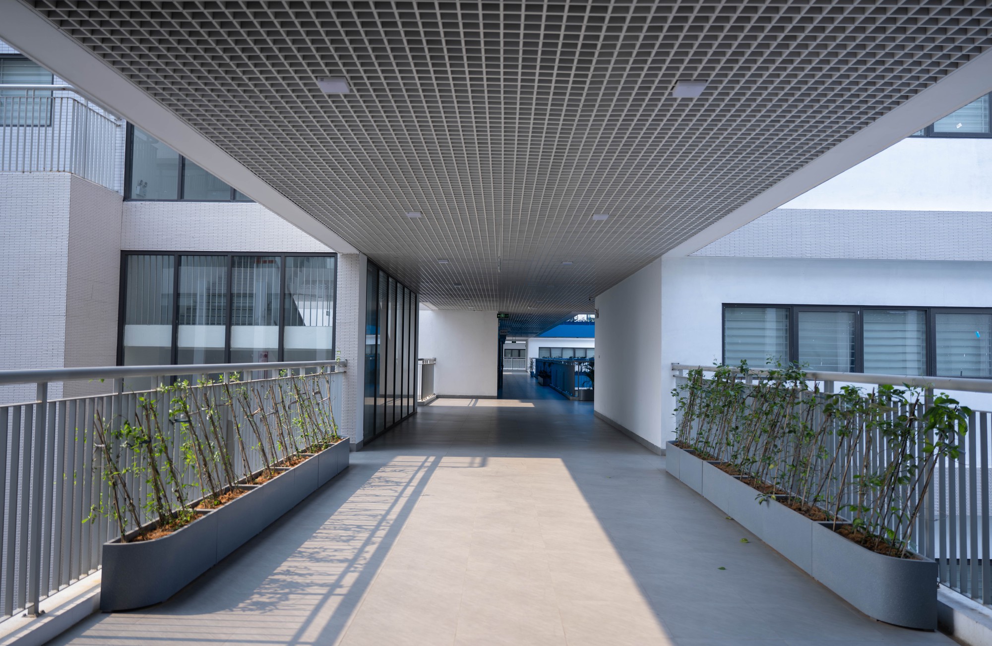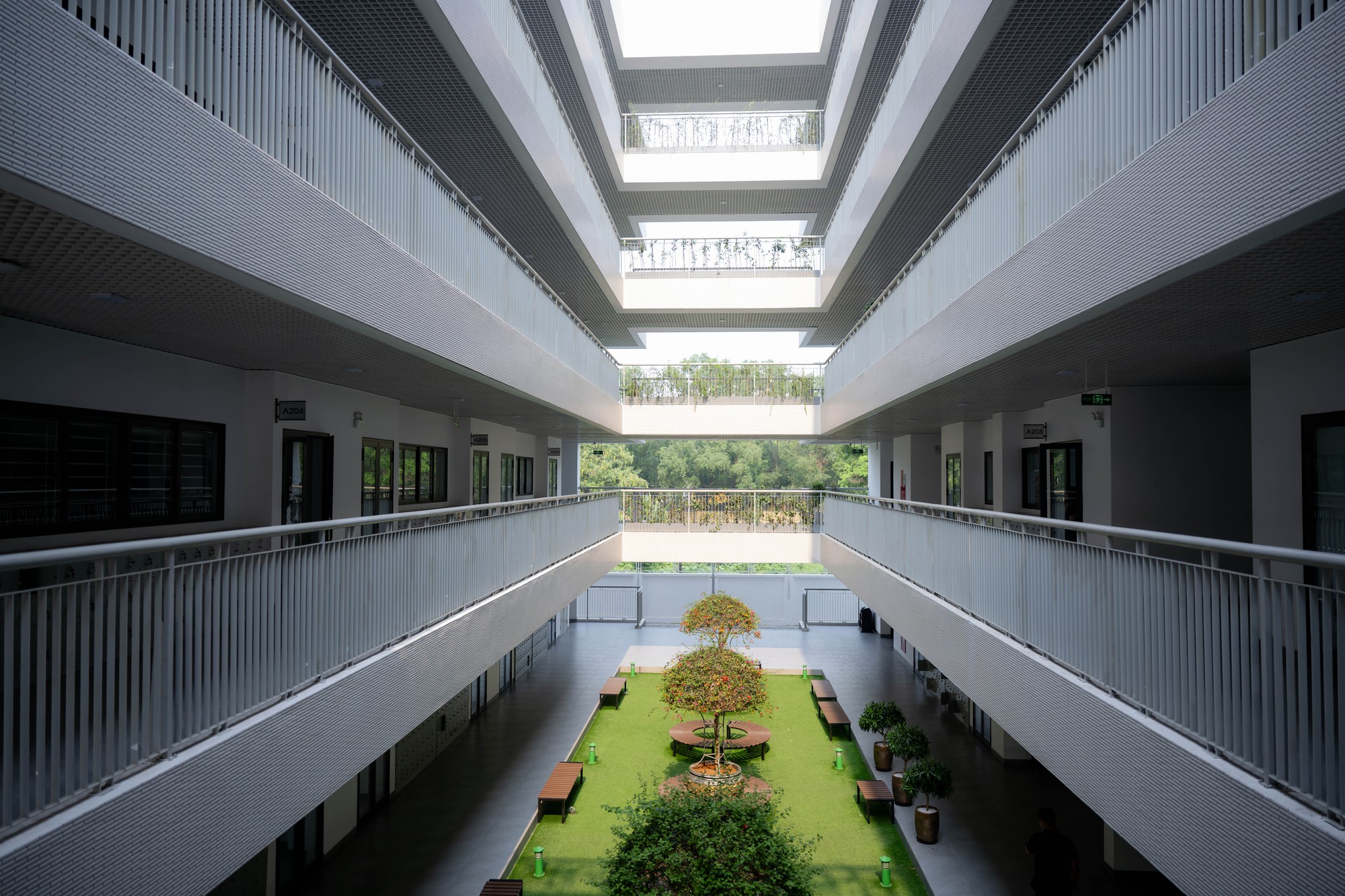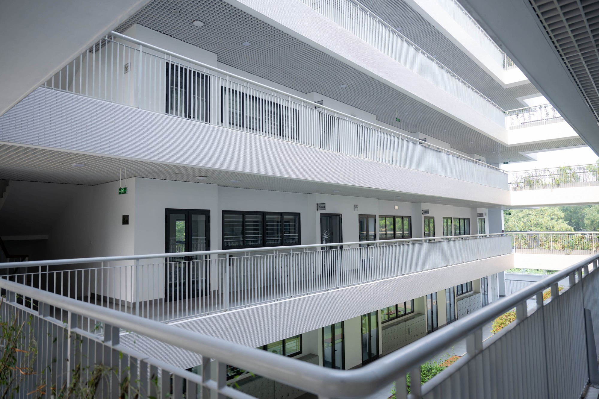 Không chỉ dừng lại ở quy mô, cách tổ chức không gian bên trong trường cũng là yếu tố khiến nhiều người ấn tượng. Có một khu vực được các bạn gọi vui là “công viên” thực chất là giếng trời nằm giữa hai khối phòng học, được thiết kế thành không gian mở để vui chơi, đọc sách và thư giãn trong giờ ra chơi.
