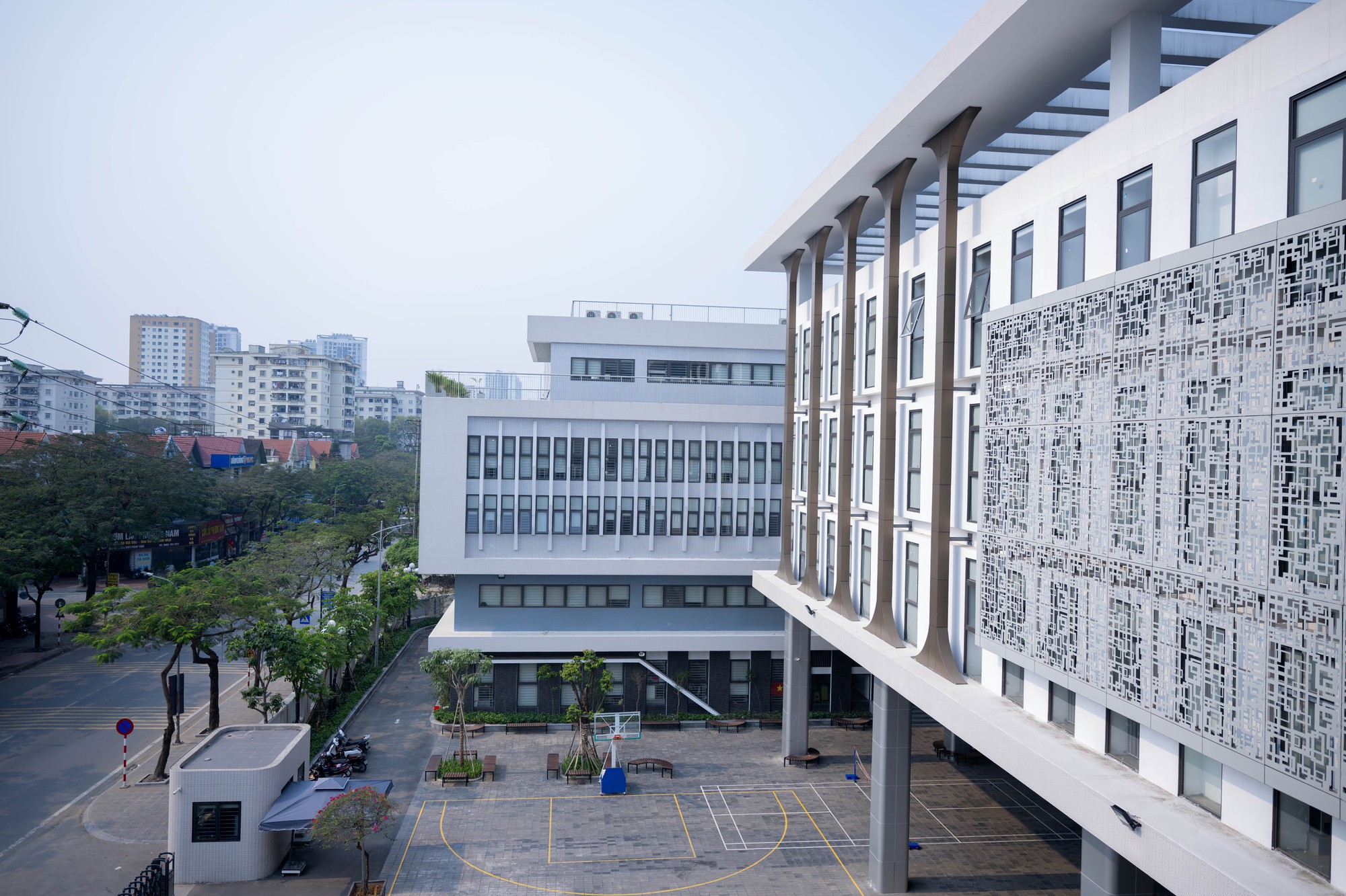 Với diện tích gần 8.000m², trường được thiết kế theo hình chữ U, gồm hai khối nhà chính cao 5 tầng nổi và một tầng hầm