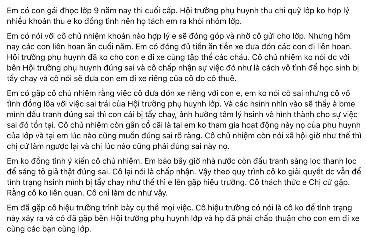 Theo nội dung phụ huynh chia sẻ, trong suốt năm học, chị không đồng tình với một số khoản thu chi do hội trưởng hội phụ huynh đề xuất, cho rằng có dấu hiệu không minh bạch và vượt quá nhu cầu thực tế của học sinh. Vì vậy, chị quyết định chỉ đóng những khoản mà chị đánh giá là hợp lý, thông qua cô giáo chủ nhiệm thay vì nộp trực tiếp cho ban phụ huynh.