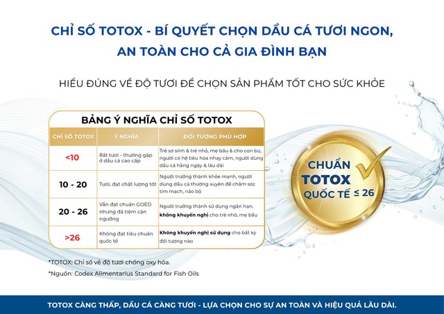 Theo các tiêu chuẩn quốc tế Codex của FAO/WHO khuyến nghị TOTOX ≤ 25. Một số tổ chức trong ngành omega-3 đưa ra ngưỡng tương tự, khoảng ≤ 26