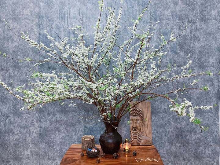 Do bình tuyết mai thường cao và to, vị trí trưng bày lý tưởng là những góc thoáng, khu vực trung tâm trong nhà, trên phông nền màu trầm hoặc không gian trang trí mộc mạc. Cách bài trí này sẽ góp phần tạo nên một không gian hoa thư giãn, nhẹ nhàng, mang lại cảm giác bình an cho mùa Tết.