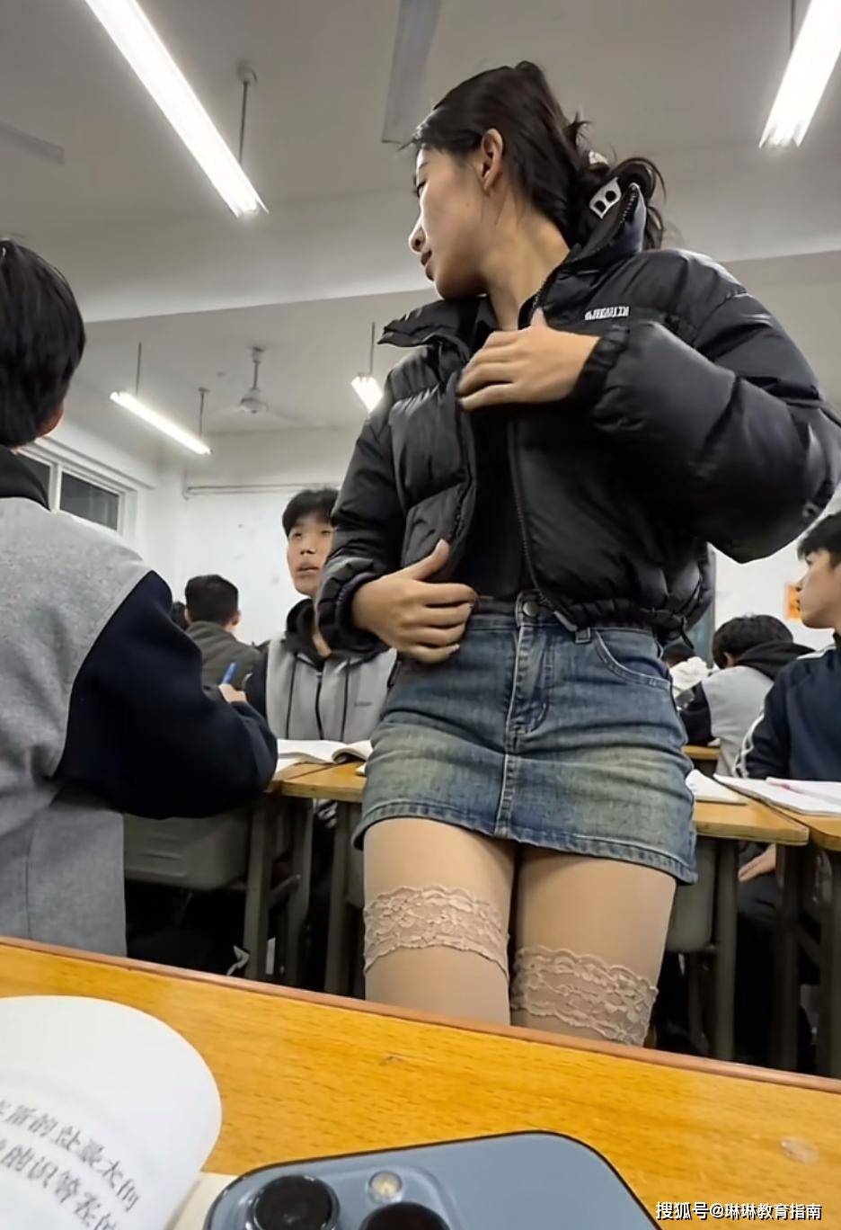 Tại một trường trung học phổ thông ở Trung Quốc, cô giáo này đã khiến toàn bộ học sinh và đồng nghiệp phải "sốc" khi xuất hiện với bộ đồ không thể lạc quẻ hơn: Áo phao dáng ngắn đi cùng chân váy denim siêu ngắn và tất ren lưới. Hình ảnh này ngay lập tức bị cộng đồng mạng nước này gắn mác "phản cảm" và "thiếu tôn trọng nghề giáo".