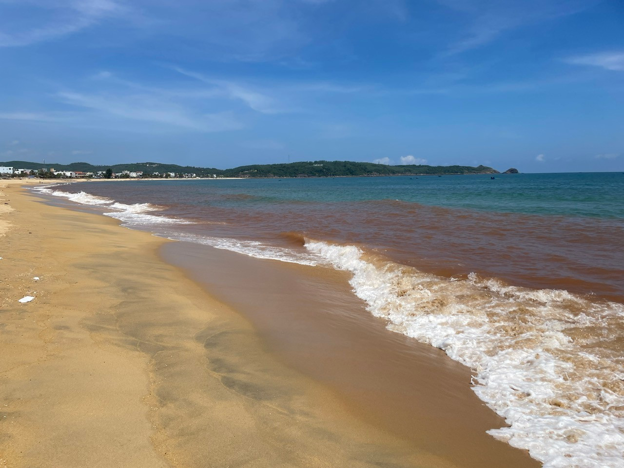 Ghi nhận của PV Tiền Phong ngày 24/2, tại khu vực bờ biển thôn Thiện Chánh, dải nước đổi màu có thể quan sát bằng mắt thường. Dải nước màu nâu đỏ rộng khoảng 20 - 30m kéo dài hàng km. Vệt nâu đỏ trải dài ven bờ, nổi bật giữa nền nước biển xanh, khiến không ít người tò mò.