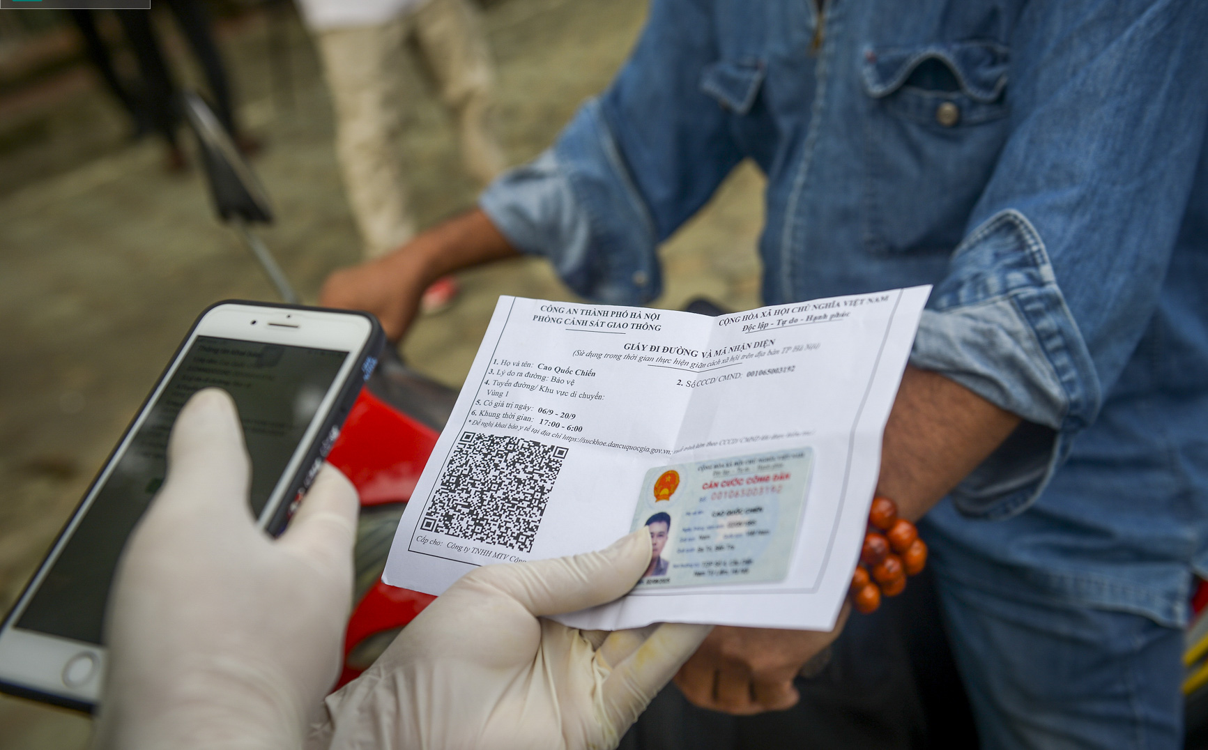 Lực lượng công an lập biên bản xử phạt ông Chính 2 triệu đồng về hành vi ra đường không có lý do chính đáng - Ảnh: B.A.