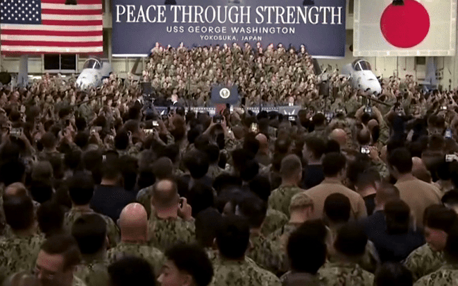 Trước đó, ông Hegseth đã có bài phát biểu trước các binh sĩ tại căn cứ hải quân của Mỹ ở Yokosuka. Trong khung cảnh phía sau là tấm biểu ngữ lớn mang dòng chữ “Hòa bình thông qua sức mạnh” cùng quốc kỳ Mỹ và Nhật Bản, ông Hegseth nhấn mạnh thông điệp “Nước Mỹ trên hết”, đồng thời khẳng định sự cần thiết phải hợp tác với các đồng minh thân cận nhất.
