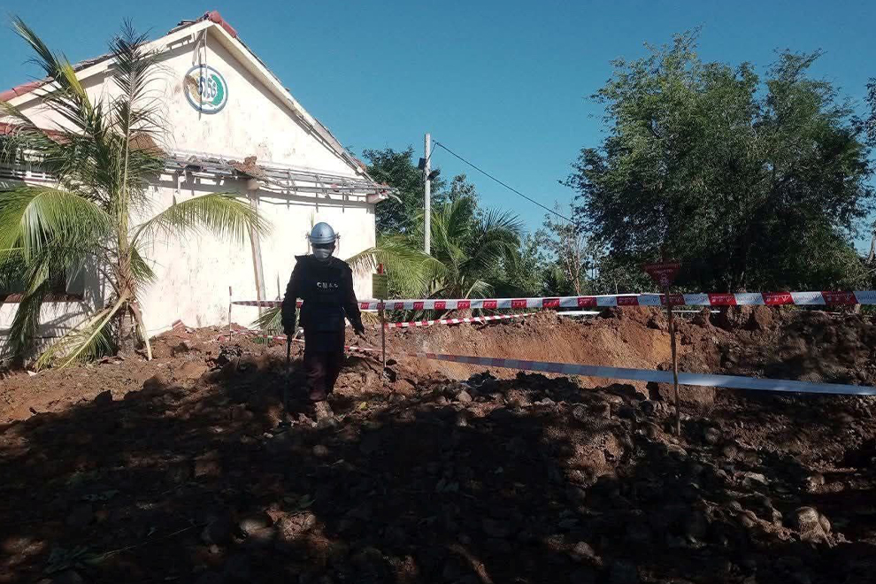 Một nhân viên của Trung tâm Rà phá Bom mìn Campuchia (CMAC) đang tìm kiếm tàn dư vật liệu nổ (ERW) tại hiện trường một cuộc không kích của Thái Lan. Ảnh: CMAC