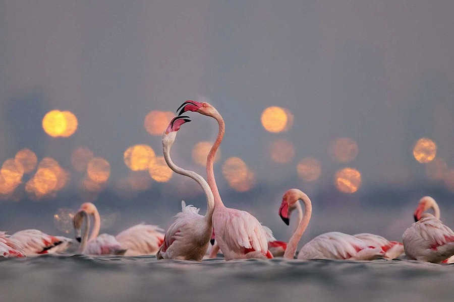 Ở hạng mục chim, Ajay Kumar Singh giành giải nhì với bức ảnh đàn hồng hạc tại Bahrain, chụp vào buổi sáng sớm khi ánh đèn đường vẫn còn sáng.