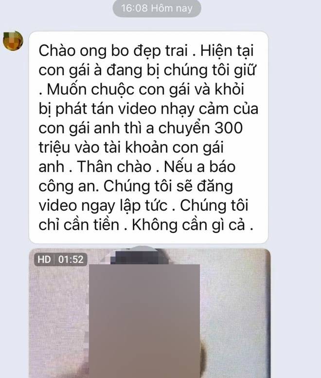 Tiếp đó, chúng bắt em vào nhà nghỉ một mình, nói rằng cần không gian riêng để "điều tra". Qua Zoom, gã đàn ông mặc sắc phục công an bắt em cởi quần áo, giả vờ kiểm tra hình xăm và đặc điểm nhận dạng, rồi bí mật ghi lại clip. Ngay sau đó, clip được gửi về Zalo bố em cùng yêu cầu chuyển 300 triệu nếu không muốn bị phát tán.