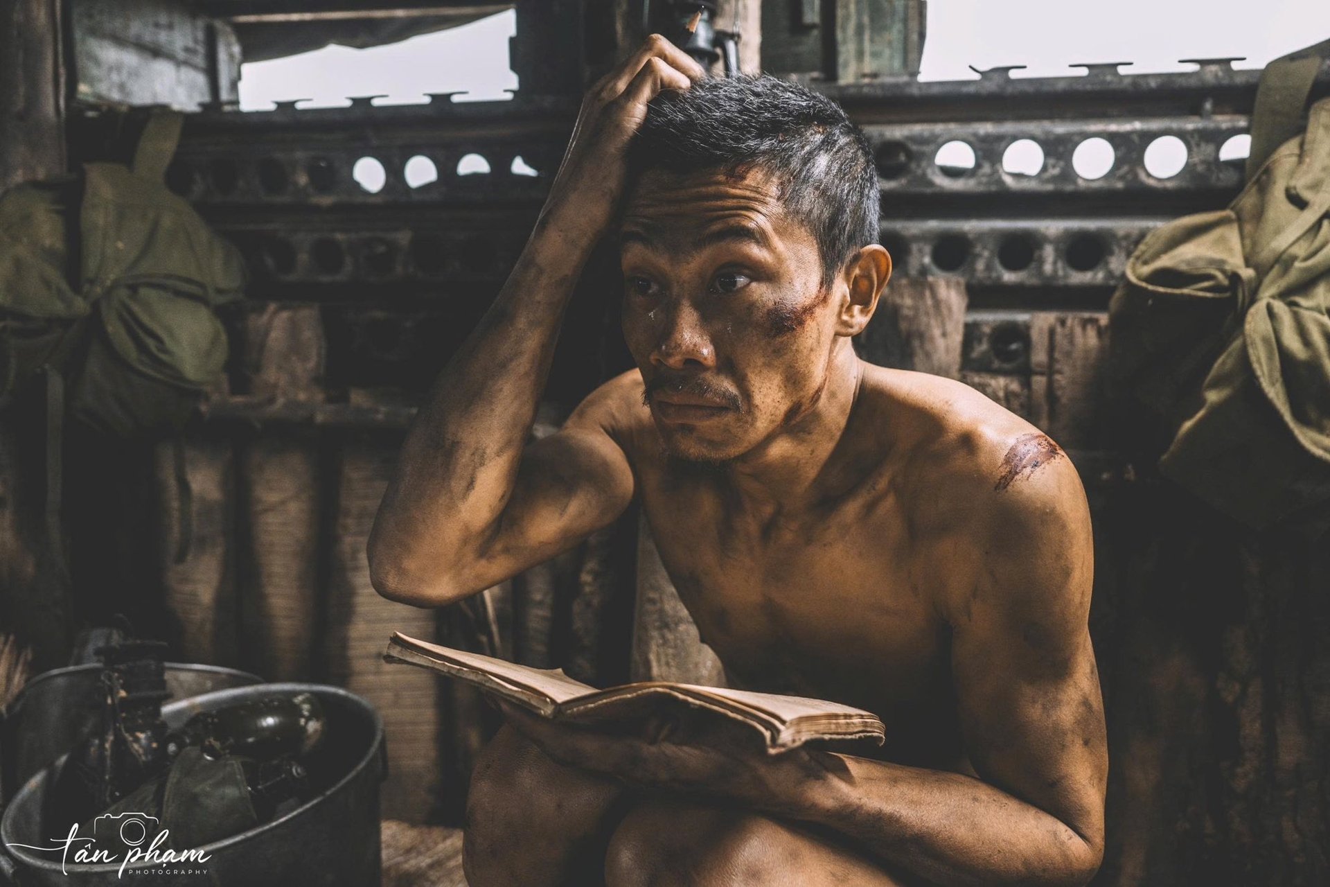 Cảnh anh Tạ viết thư về cho vợ trong phim Mưa đỏ (Ảnh: Tân Phạm)