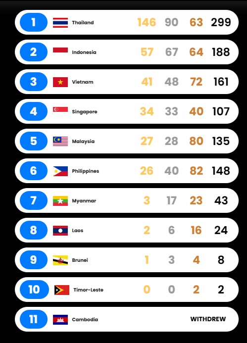 Tính tới 14h30 ngày 16/12, đoàn Việt Nam mới giành 41 HCV, kém xa Indonesia (57 HCV) và đặc biệt là chủ nhà Thái Lan (146 HCV).