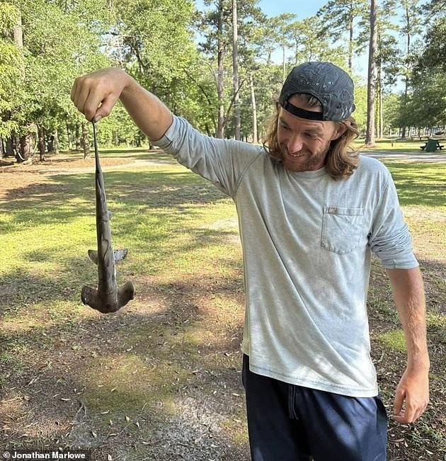 Ông Jonathan Marlowe giơ con cá búa nhỏ lên, nó đã chết khi được thả xuống gần nơi ông đang chơi đĩa golf với bạn bè.
