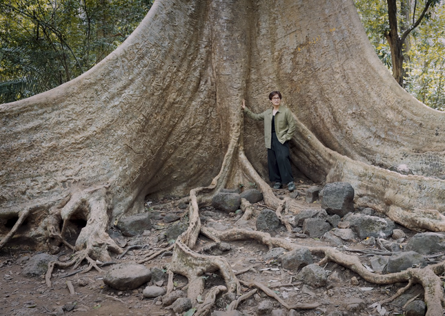 Ca sĩ Hà Anh Tuấn bên gốc cây Tung cổ thụ, một trong những báu vật của Vườn Quốc gia Cát Tiên. Ảnh cắt từ màn hình video.