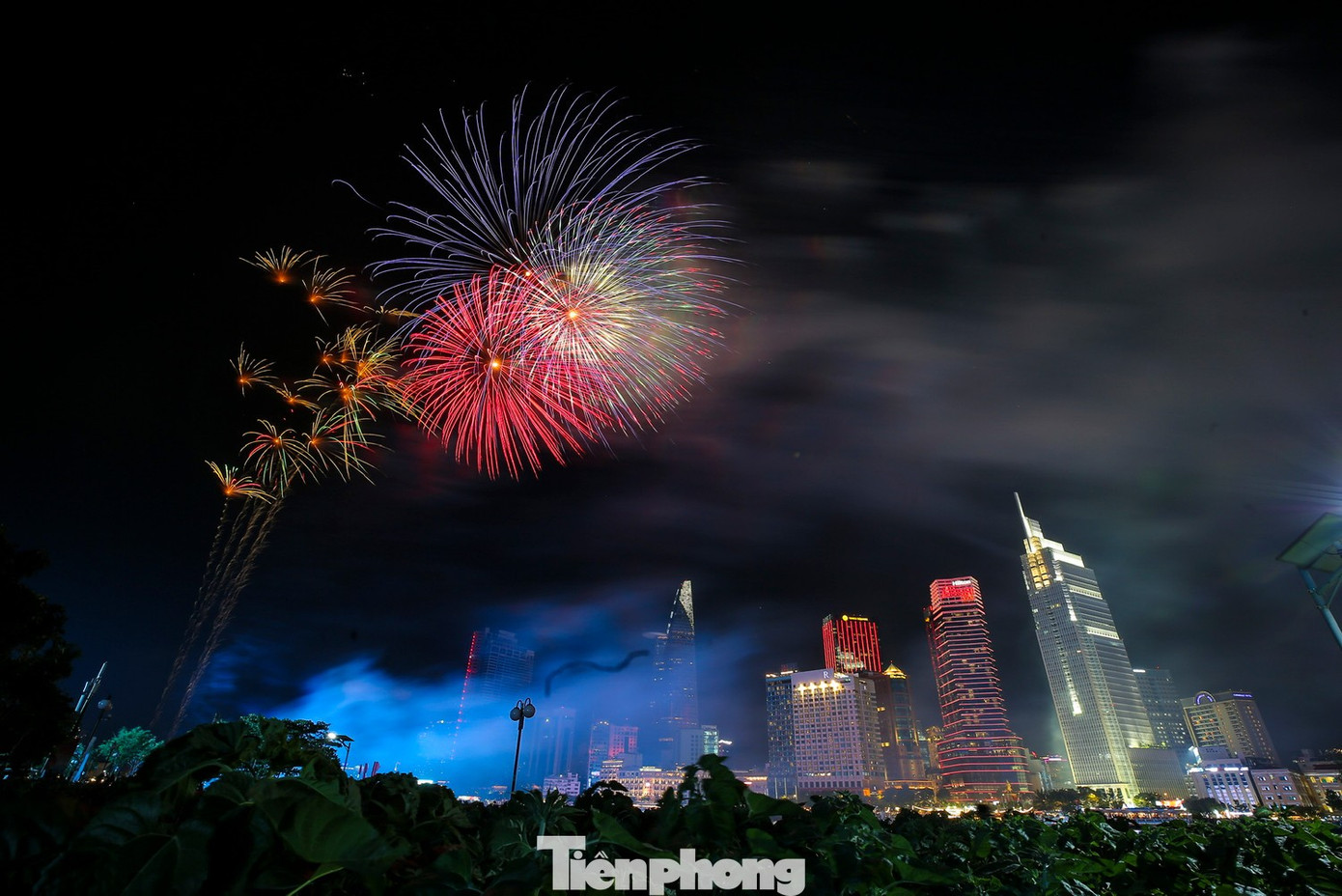 Màn trình diễn pháo hoa chào mừng 50 năm thống nhất rực sáng trên bầu trời TPHCM. Ảnh: Duy Anh
