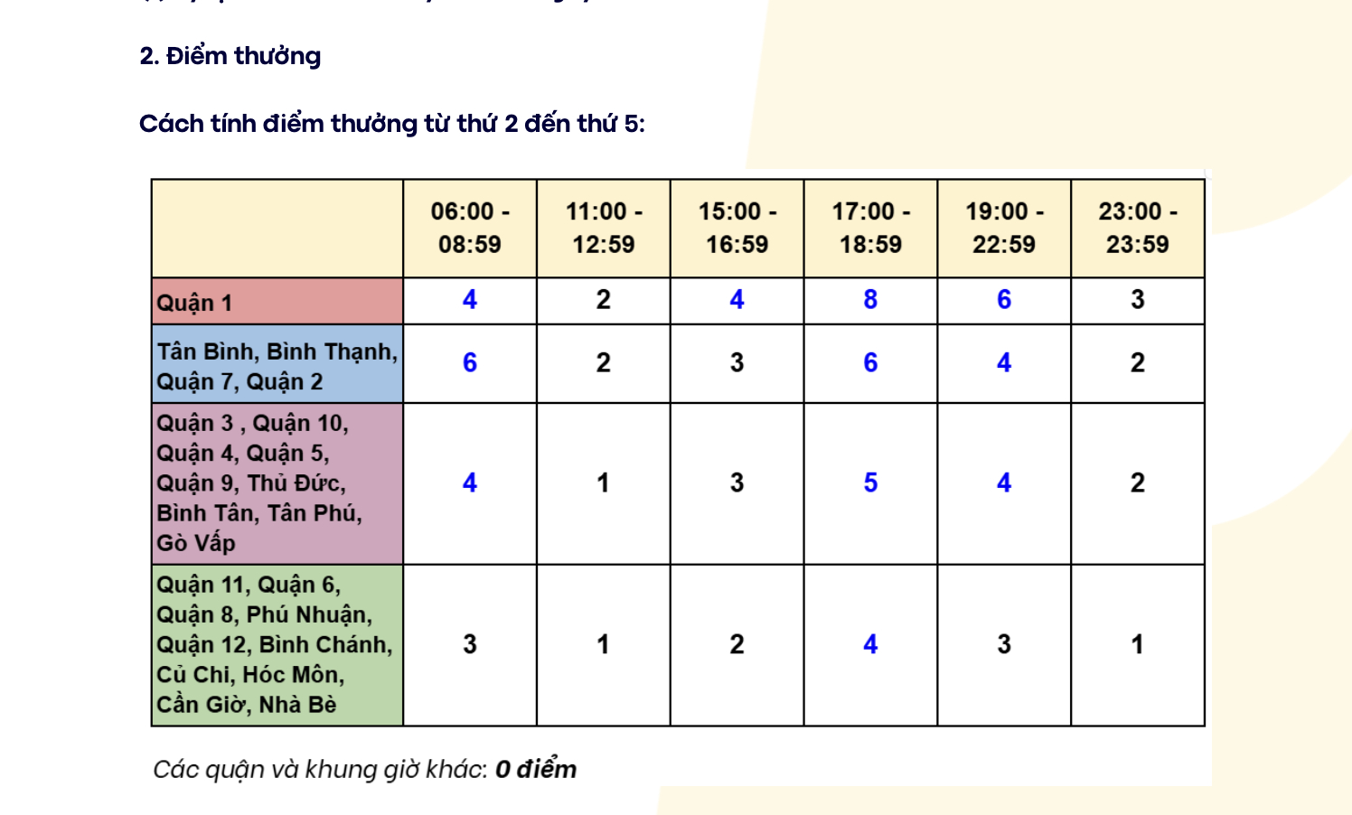 - Bác tài hoàn thành chuyến xe với quãng đường 10km có thời điểm nhận chuyến là 17:10 ở Quận 2, bác tài nhận được 6+4 = 10 điểm.