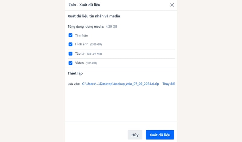 Bước 3 : Khi đó, trên màn hình hiển thị lựa chọn loại dữ liệu muốn xuất file gồm tin nhắn, hình ảnh, tập tin và video nên tùy theo nhu cầu, bạn tích chọn các kiểu dữ liệu mong muốn. Đồng thời, người dùng chọn nơi lưu file khôi phục ở mục Thiết lập bằng cách nhấn chọn Thay đổi.