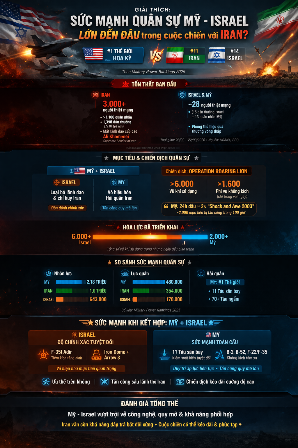 Xét về tổng thể, liên minh Mỹ-Israel sở hữu ưu thế vượt trội cả về công nghệ , quy mô lẫn khả năng phối hợp tác chiến. Tuy nhiên, chiến tranh hiện đại không chỉ được quyết định bằng sức mạnh quân sự thuần túy.