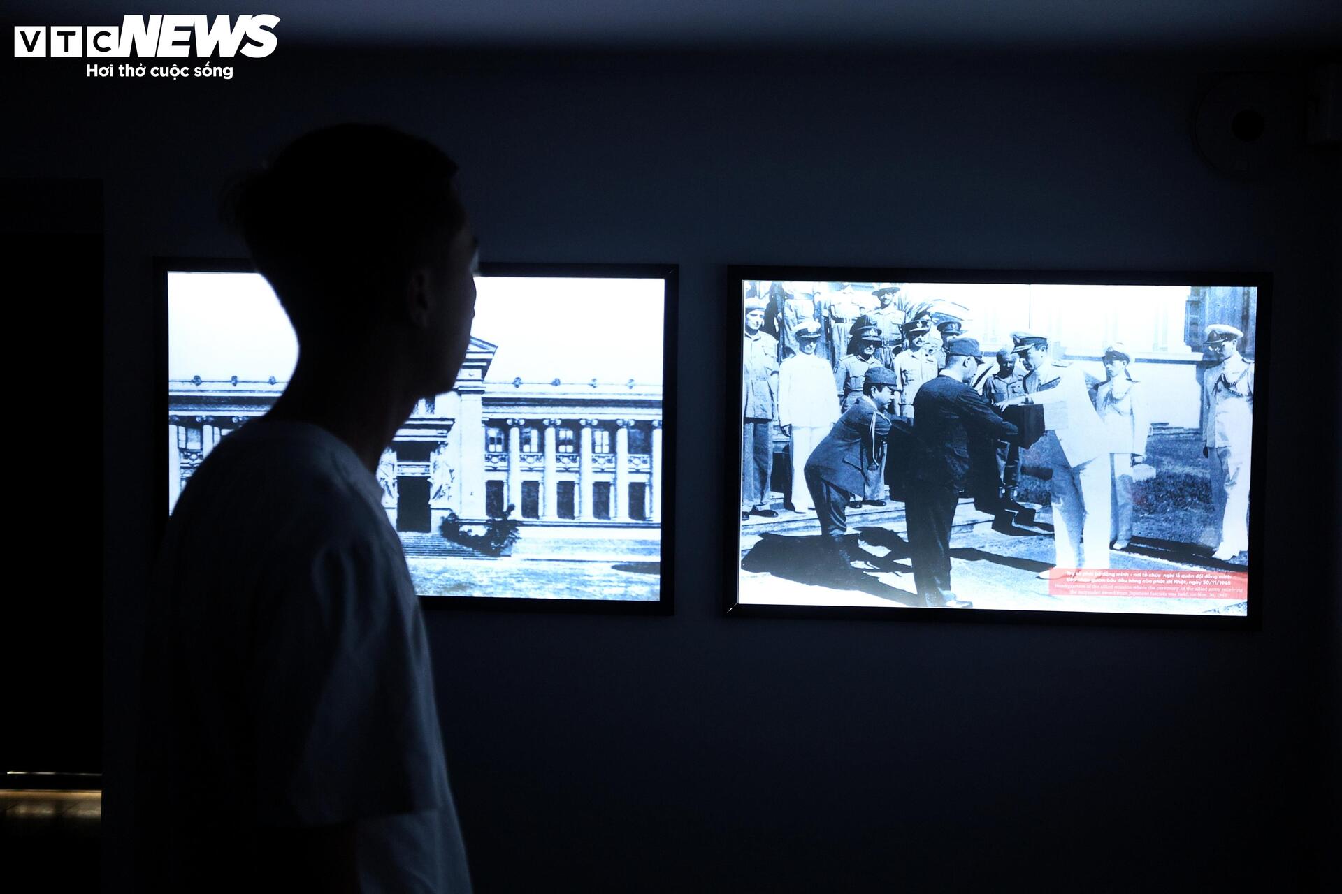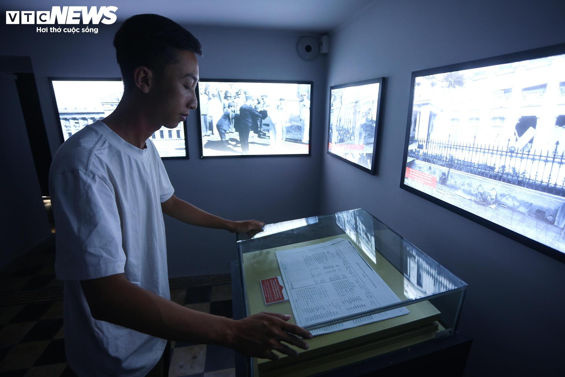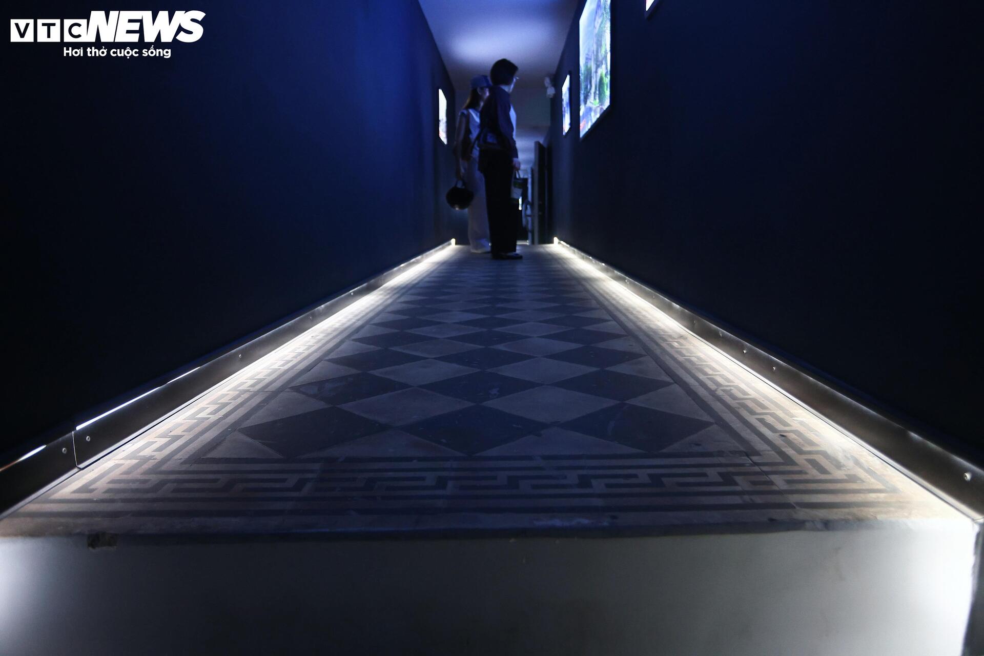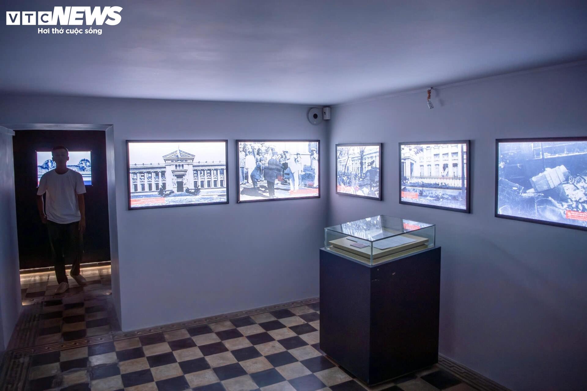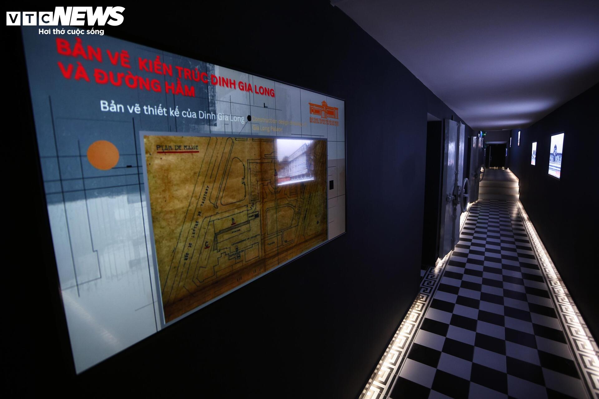 Bên trong hầm, nhiều màn hình được lắp đặt dọc hành lang và trên tường, trình chiếu bản vẽ thiết kế Dinh Gia Long cùng các tư liệu lịch sử, hình ảnh về các cuộc đảo chính và những di tích tiêu biểu của thành phố.