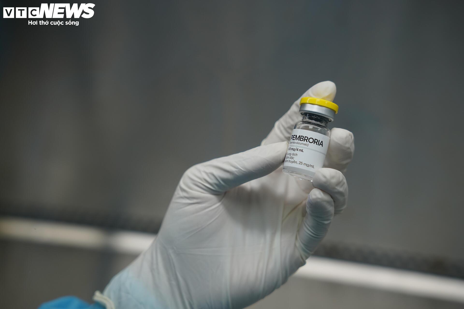 Từng thao tác pha thuốc được thực hiện cẩn trọng, với liều lượng tính toán riêng cho từng bệnh nhân. "Thuốc Pembroria chứa hoạt chất pembrolizumab - cơ chế giúp loại bỏ “lớp ngụy trang” của tế bào ung thư, từ đó kích hoạt hệ miễn dịch nhận diện và tấn công khối u, thay vì tiêu diệt trực tiếp như các phương pháp truyền thống", Bác sĩ CKI Ninh Công Vi - Phó Giám đốc Trung tâm Ung bướu, Xạ trị và Y học hạt nhân Quốc tế, Bệnh viện Đa khoa Phương Đông cho biết.
