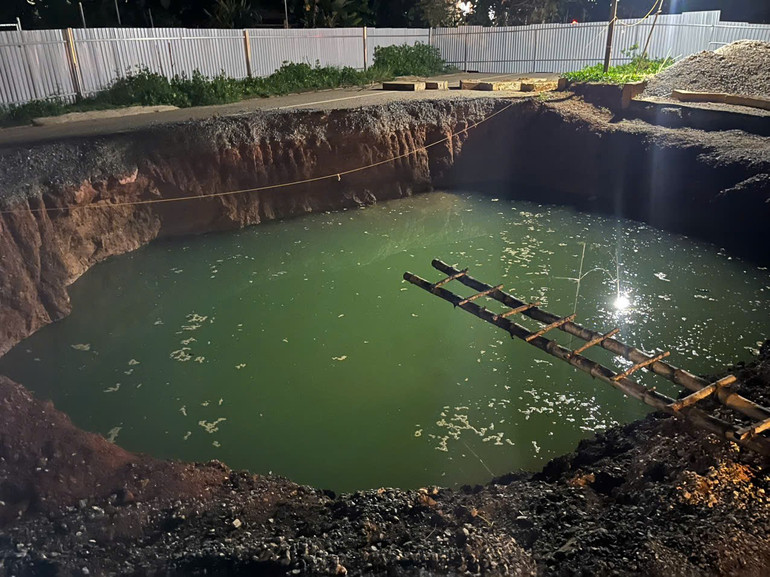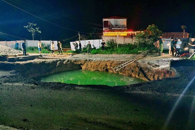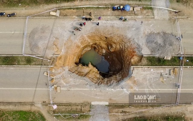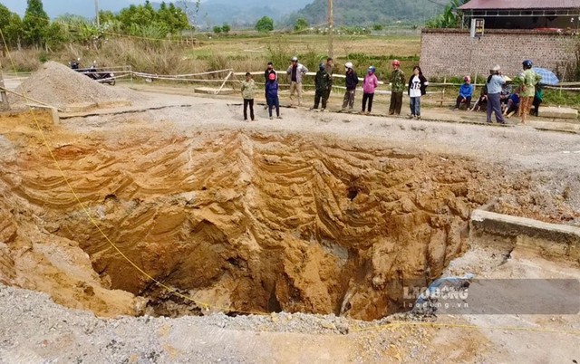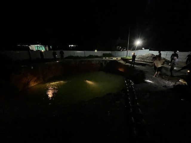 Tuy nhiên, vị trí sụt lún có độ sâu lớn, có khả năng có hang nước ngầm phức tạp, gây nguy hiểm tại khu vực xảy ra vụ việc, trong khi không có trang thiết bị chuyên dụng, hiện đại nên chưa có kết quả (Ảnh: Báo Lao Động).