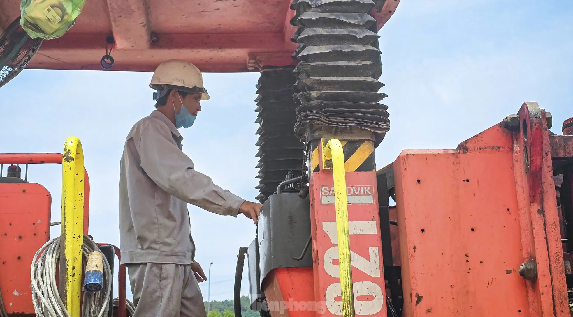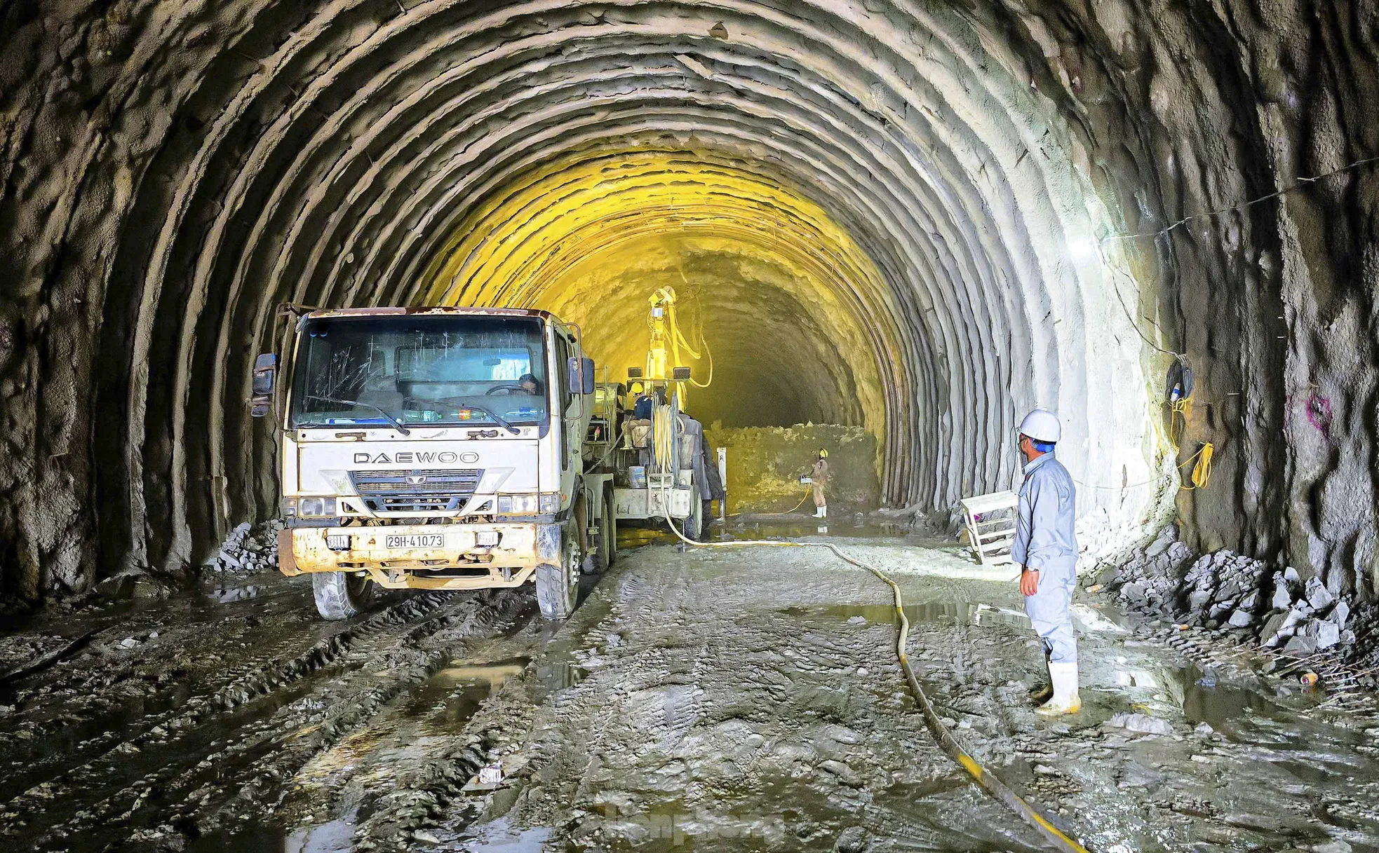 “Làm việc trong hầm không ảnh hưởng nhiều bởi thời tiết song khói bụi và môi trường bí bách hơn nên anh em phải mặc bảo hộ dày, đội mũ, đeo khẩu trang làm việc liên tục”, anh Cường (quê Thanh Hóa) chia sẻ. Trong hình công nhân, kỹ sư cùng nhiều thiết bị, máy móc, robot đào hầm hiện đại làm việc xuyên suốt ngày đêm.