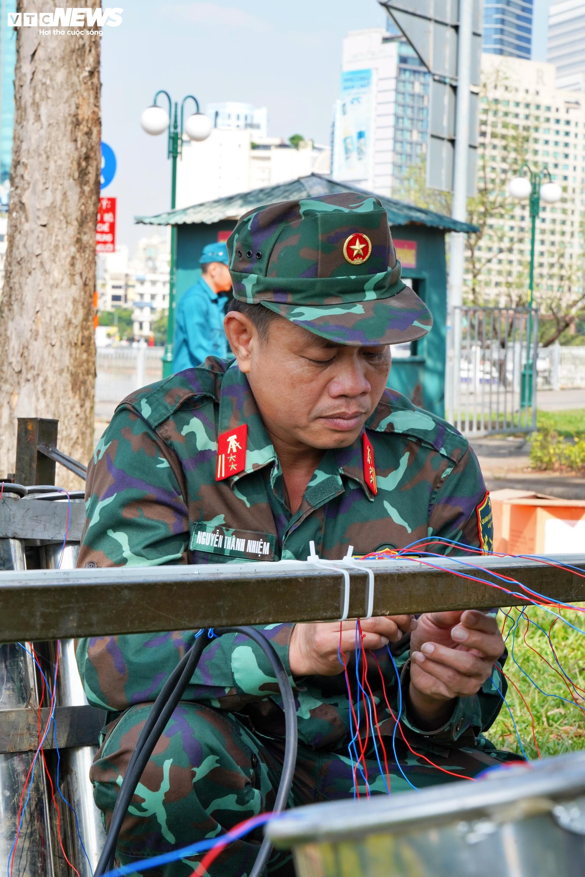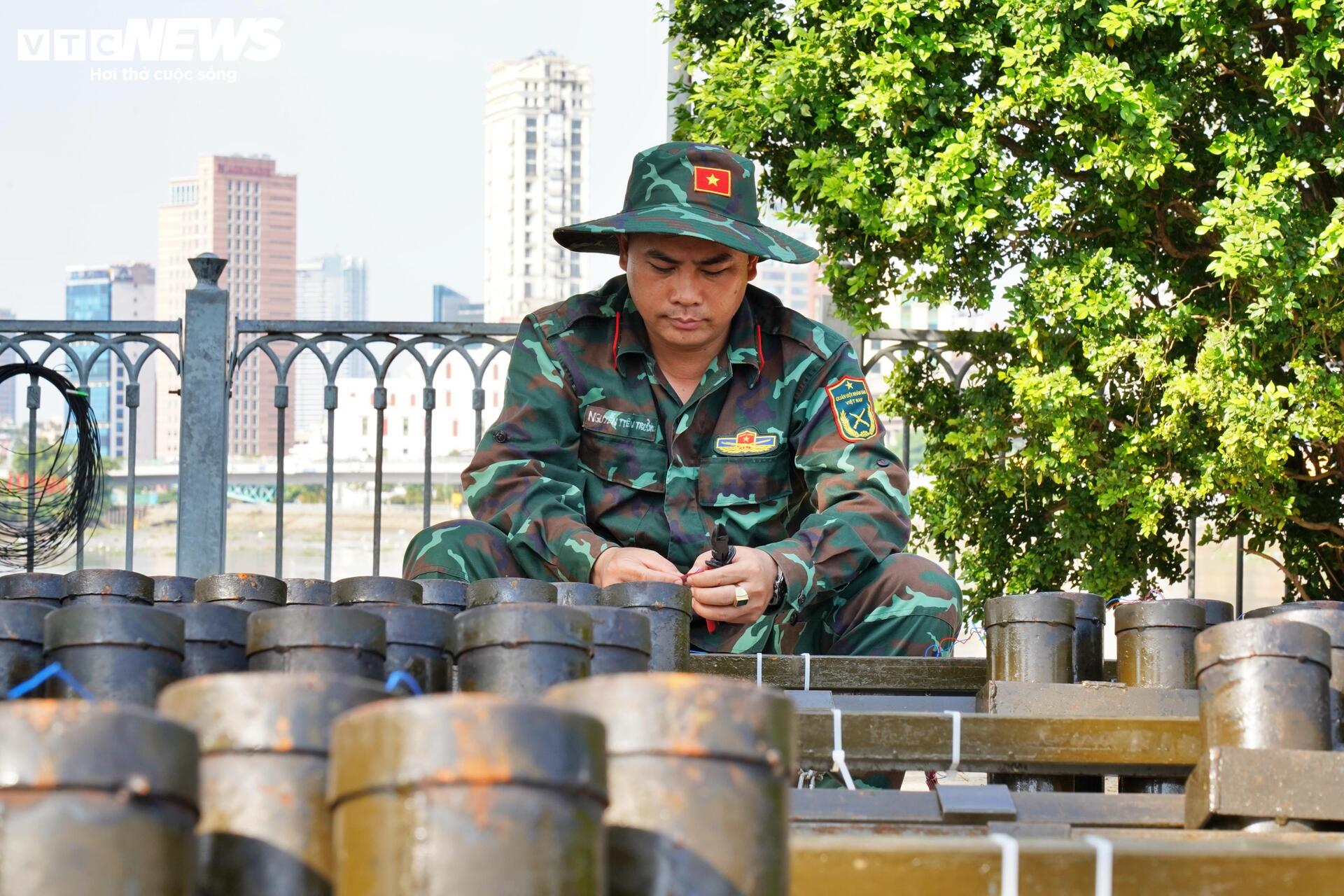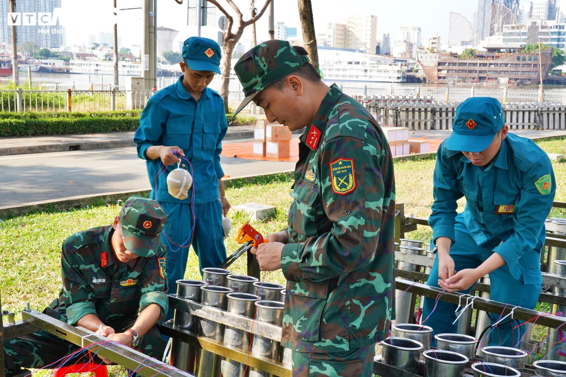 "Riêng điểm tầm cao công viên hầm vượt sông Sài Gòn, công tác chuẩn bị diễn ra trong 2 ngày. Cụ thể trước đó 1 ngày chúng tôi đã phải chuẩn bị công tác sắp xếp nòng, đi dây điện và trong hôm nay chúng tôi kết hợp đạn cũng như đấu nối đạn vào giàn pháo", Trung tá Nhiệm cho biết thêm.