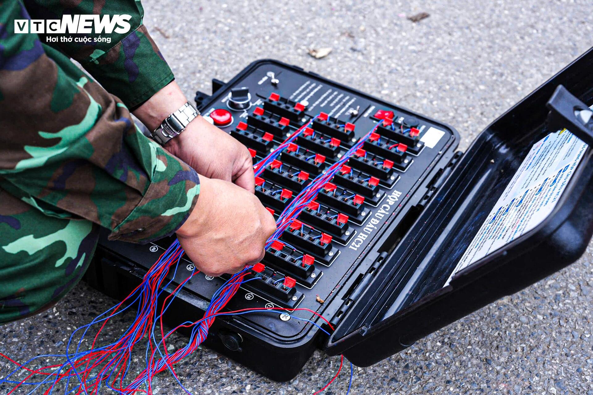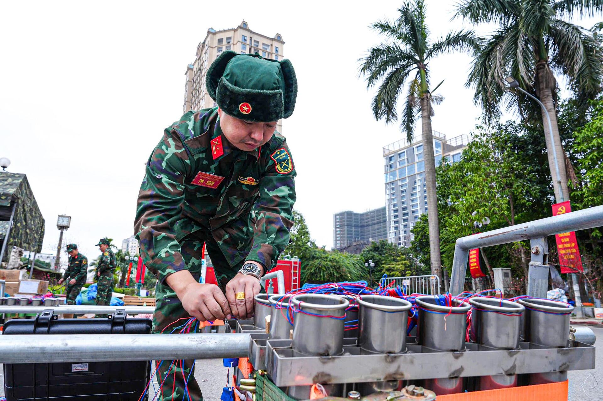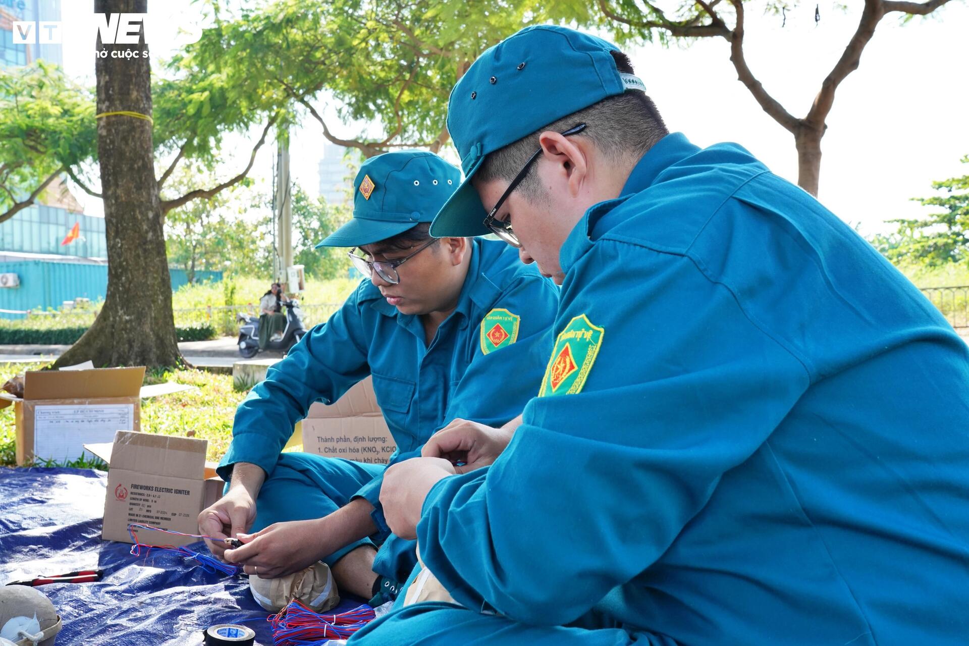 "Riêng điểm tầm cao công viên hầm vượt sông Sài Gòn, công tác chuẩn bị diễn ra trong 2 ngày. Cụ thể trước đó 1 ngày chúng tôi đã phải chuẩn bị công tác sắp xếp nòng, đi dây điện và trong hôm nay chúng tôi kết hợp đạn cũng như đấu nối đạn vào giàn pháo", Trung tá Nhiệm cho biết thêm.