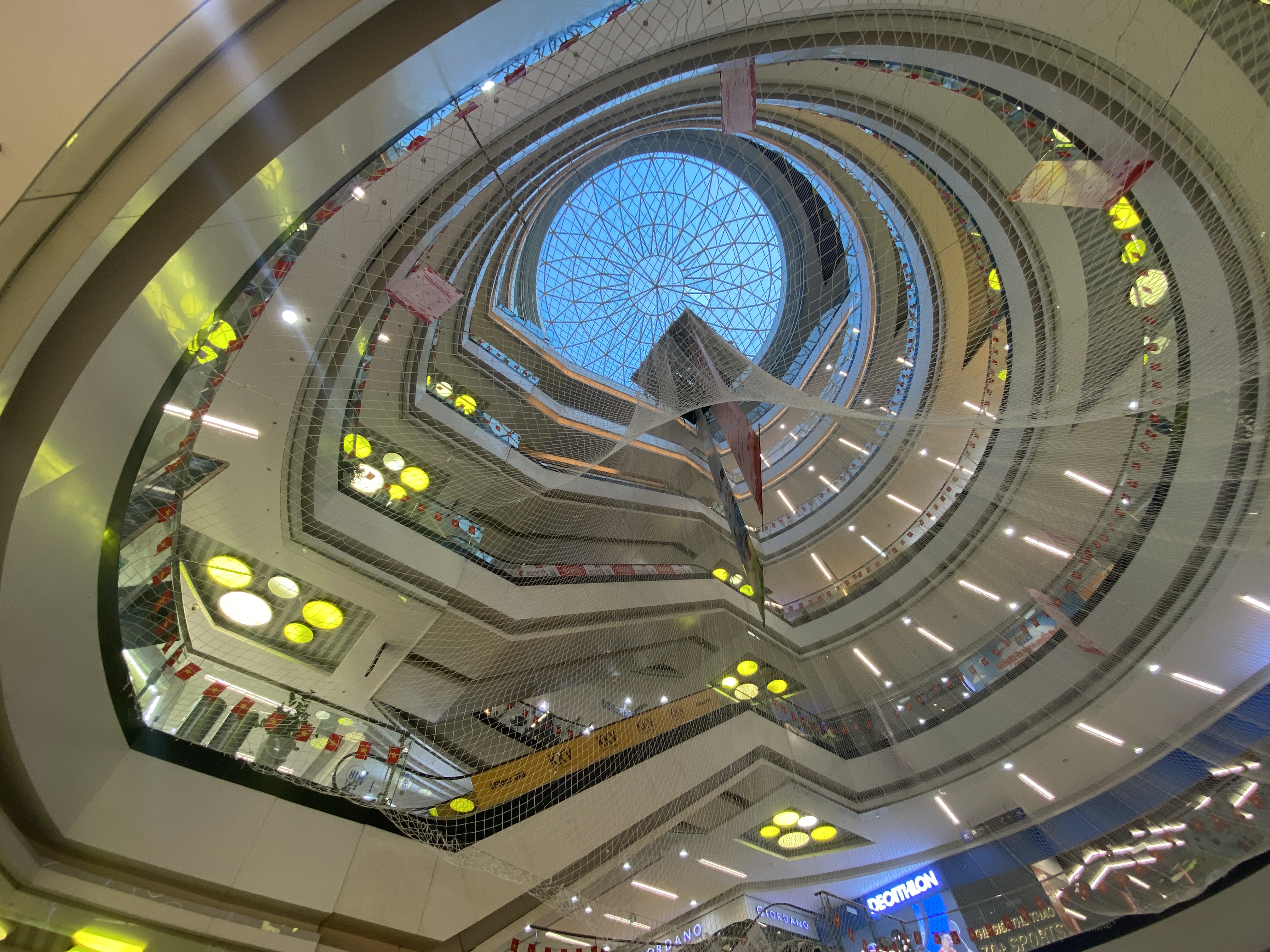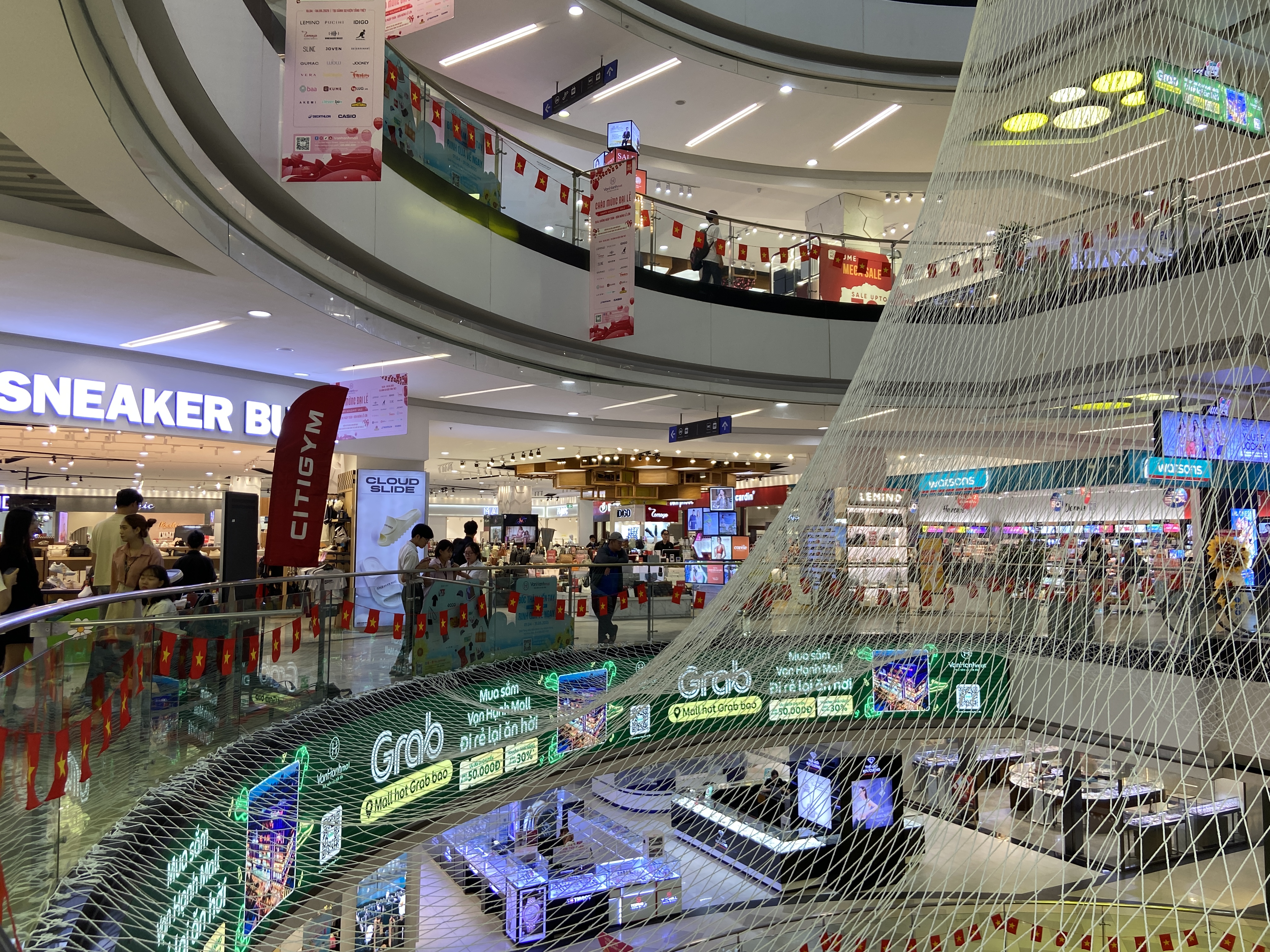 Có thể thấy, hệ thống lưới an toàn được thiết kế chắc chắn, bao phủ toàn bộ khu vực thông tầng nhằm ngăn ngừa nguy cơ tai nạn từ trên cao. Theo ghi nhận, quá trình thi công đã hoàn tất, mang lại sự an tâm cho khách tham quan lẫn các đơn vị kinh doanh hoạt động bên trong Mall.