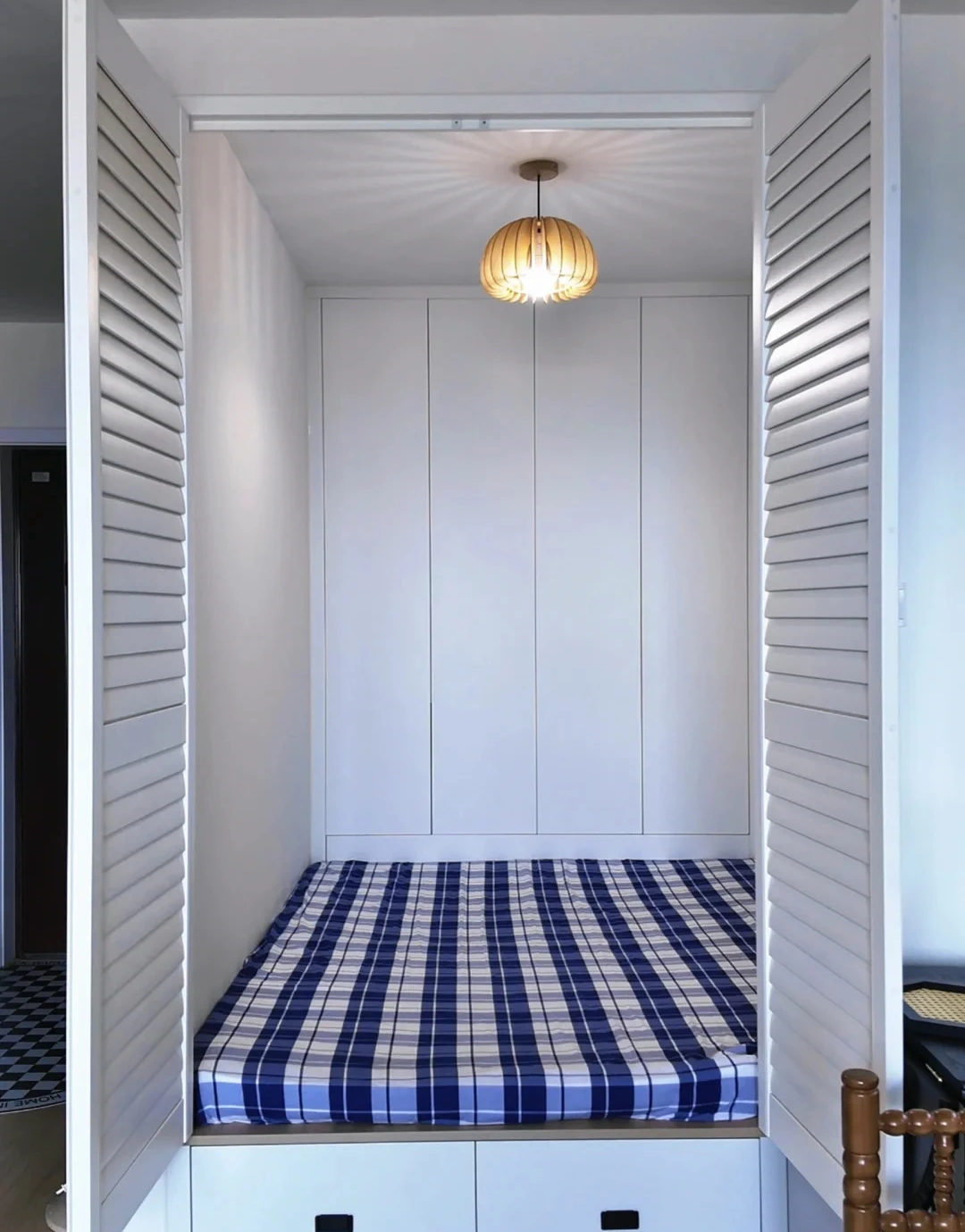 Phòng ngủ nằm trong phòng khách, được thiết kế như một cái tủ.