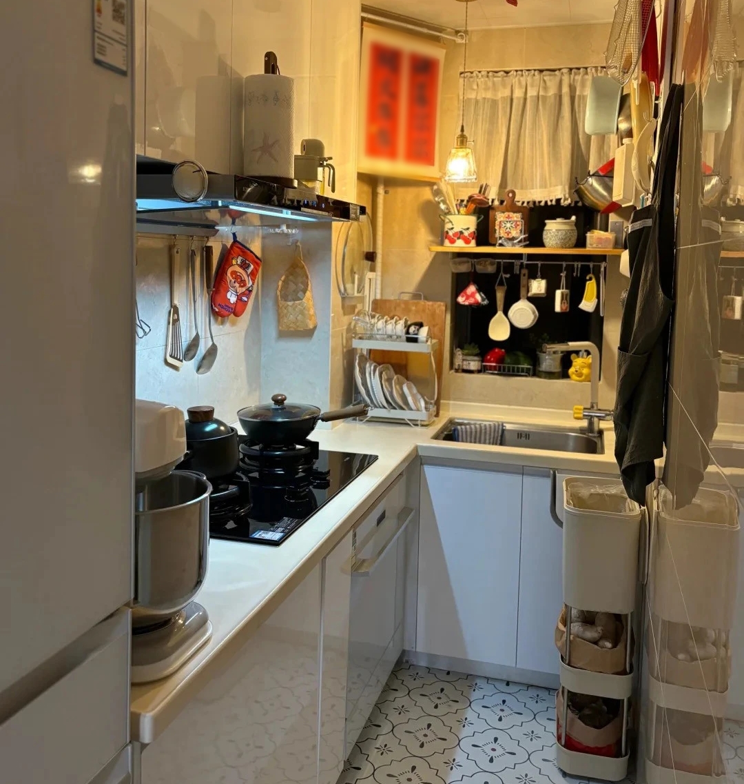 Diện tích khoảng 4m2 nhưng được bố trí đầy đủ công năng. Từ tủ bếp, tủ lạnh đến gạch ốp đều sử dụng tông trắng, giúp không gian trông rộng hơn. Gia chủ cũng tính toán sẵn vị trí cho xe đẩy và thùng rác, đảm bảo sự tiện lợi trong sinh hoạt hàng ngày. Dù nhiều đồ đạc, khu bếp vẫn mang lại cảm giác ấm cúng, đậm chất đời sống.
