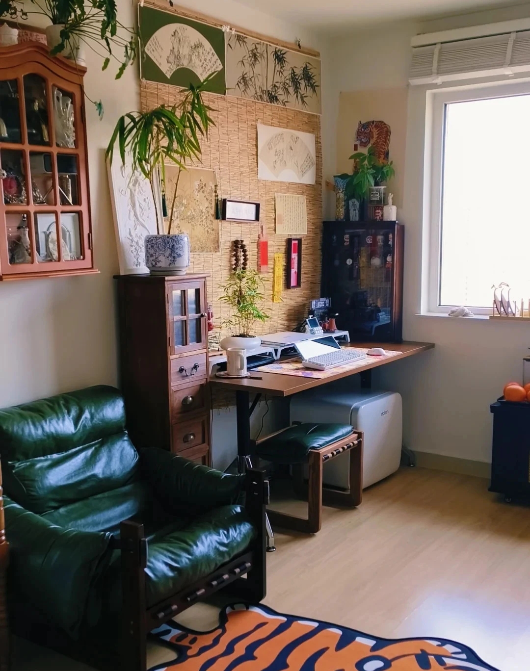 Ở khu vực làm việc, anh kết hợp thêm các yếu tố truyền thống như mây tre, tranh thủy mặc, thư pháp… tạo nên một không gian mang đậm dấu ấn cá nhân nhưng không hề rời rạc.