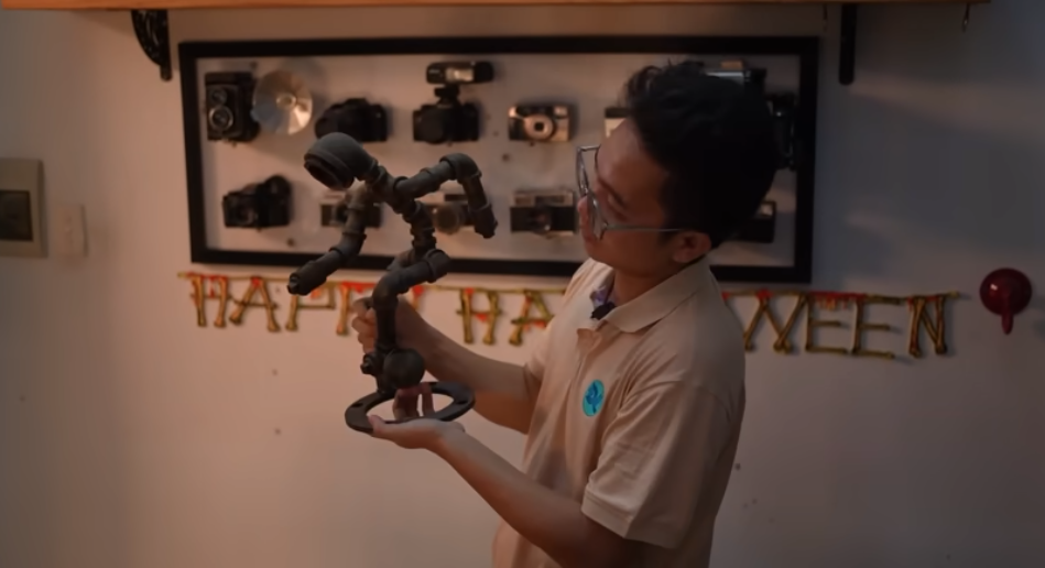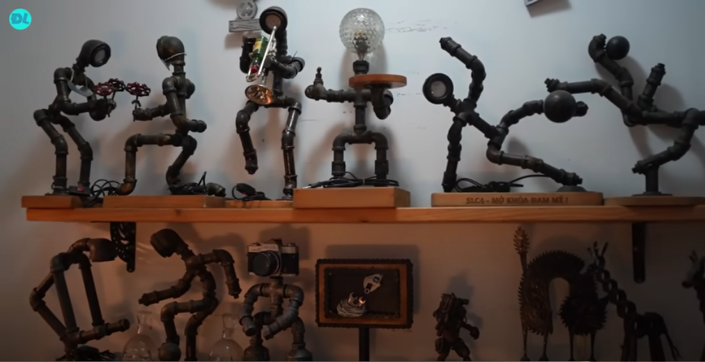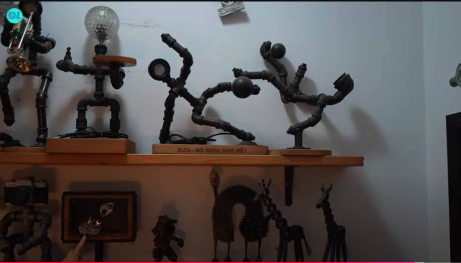 Những lúc rảnh rỗi, ông Bình còn tái chế những tuýp sắt, vòi nước, đồ cơ khí cũ, hỏng,… thành nhiều món đồ trang trí sinh động, có hồn.