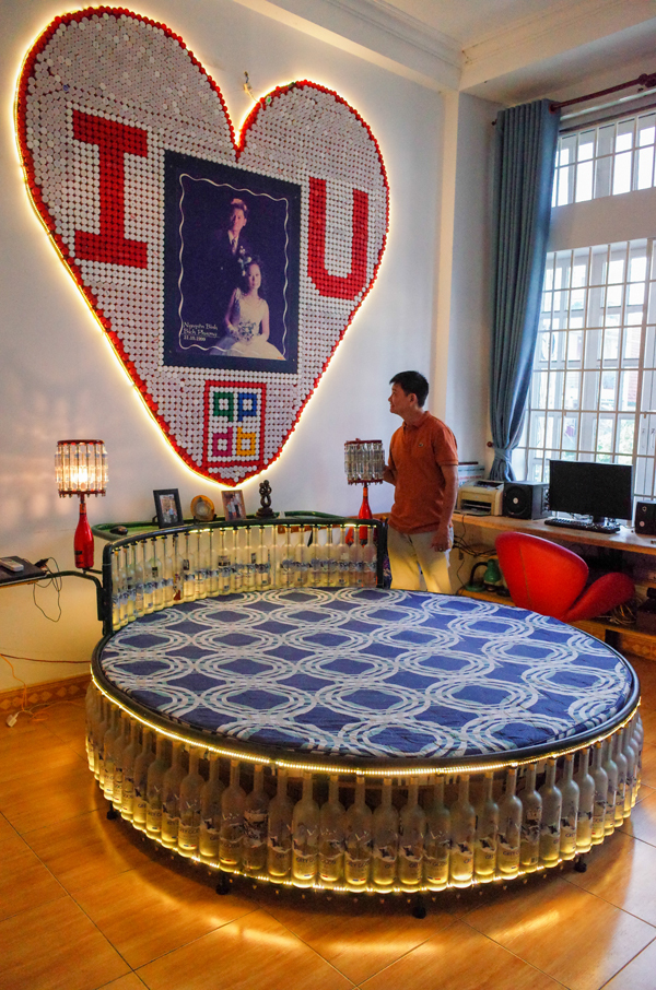 Chiếc giường được anh Bình chế tác từ 200 vỏ chai thủy tinh nhân dịp kỉ nhiệm 10 năm ngày cưới và đã được sử dụng khoảng 15 năm nay (Ảnh: VnExpress).
