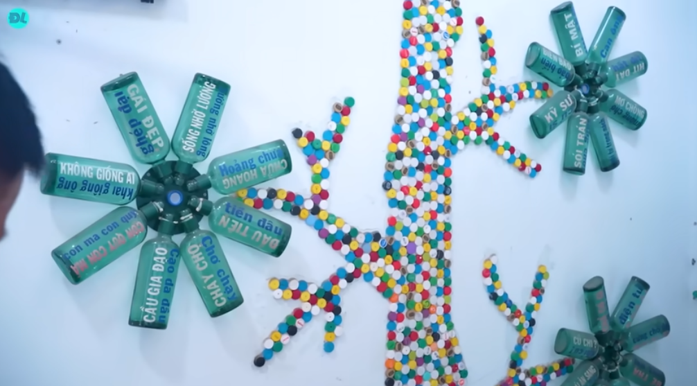 Tại phòng khách, anh trưng bày bức tranh chủ đề gia đình được kết từ hơn 3.000 nắp chai nhựa. Trong khi, dọc theo cầu thang lên các phòng trong nhà là những bức tranh khổng lồ, sống động với chủ đề thiên nhiên, gia đình được anh “vẽ” hoàn toàn bằng nắp, vỏ chai.