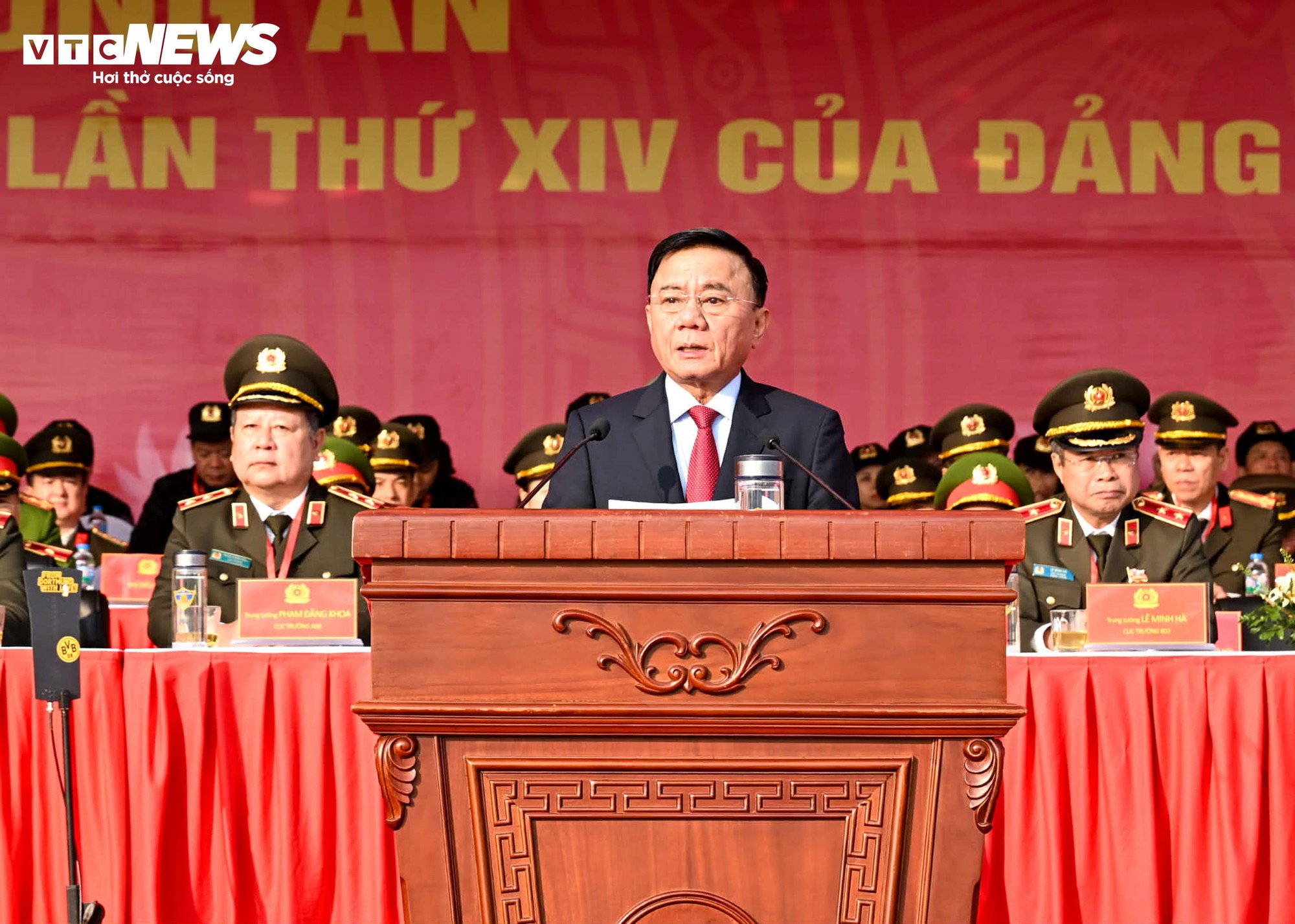 Tại Lễ xuất quân bảo vệ Đại hội Đảng lần thứ XIV, lực lượng cảnh sát diễn tập bắn súng, trấn áp tội phạm, thể hiện mức sẵn sàng cao trong bảo đảm an ninh, trật tự.